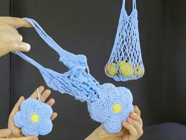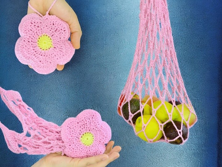 Discover the perfect combination of practical shopping net and stylish blossom bag. Unique crochet shopping net that can be easily turned inside out. A great alternative for your shopping trips, it's made from cotton to ensure a durable and long-lasting structure. You can be sure that this net will accompany you faithfully on your shopping trips. The generous size of the net offers enough space for all your purchases. Whether fresh fruit and vegetables, bread or other groceries - with this shopping net you have enough space for everything you need. But that's not all! My crochet shopping net has a special feature, which sets it apart from other net. You can turn it inside out with just one simple movement and it turns into a beautiful flower bag. The bag is also perfect for the beach, the market or everyday life. You can wear them as a fashion accessory and be environmentally conscious at the same time.
