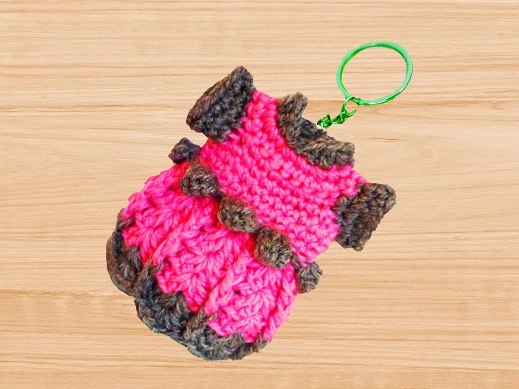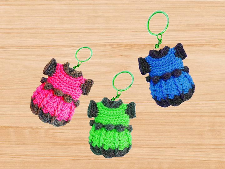 *crochet mini dress keychain is written in English, STANDARD AMERICAN TERMS.