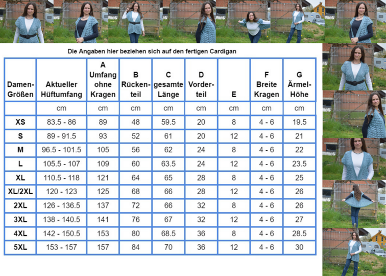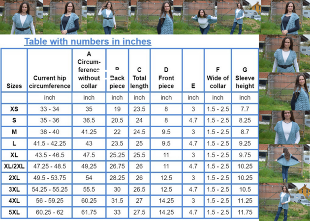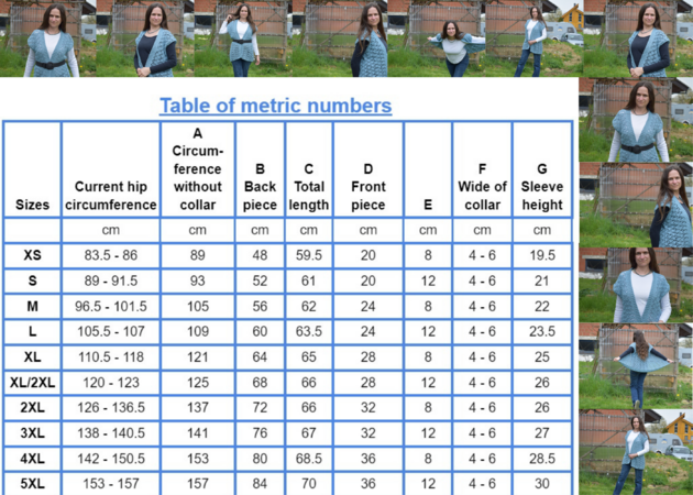 There is a schematic with accompanying table. This contains the final dimensions of the summer vest.