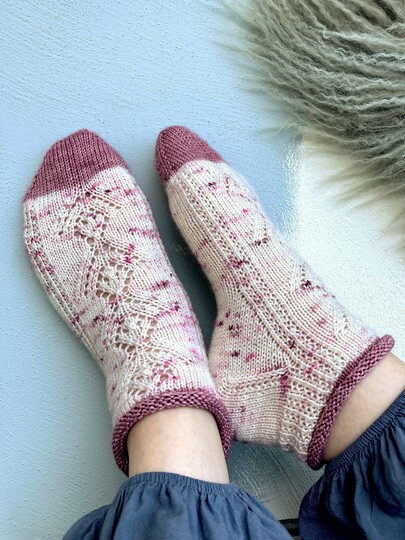 The socks are knitted toe-up. A lace pattern runs along the top of the foot to the end of the leg, while a ribbing pattern on the back of the leg provides good fitting. You knit the leg up to your desired height - anything from sneaker to sock is possible - and for the finish, you can opt for a rolled hem, ribbed cuff, or double-layered cuff. The heel is an increasing heel with German short rows, it is explained in detail so that you master it perfectly!