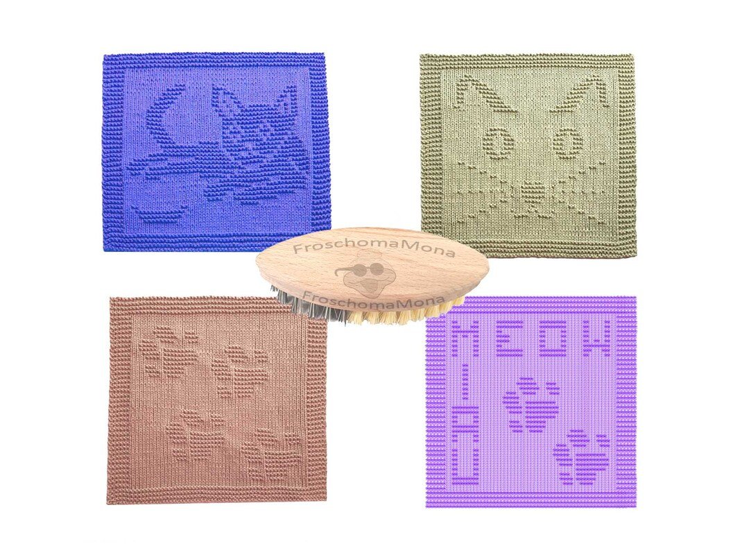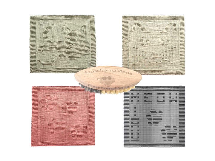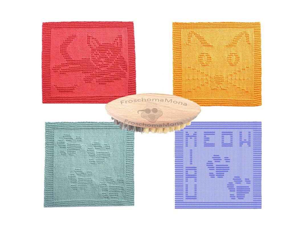 In diesem Angebot erhältst du 4 Strickanleitungen für Spültücher / Pfotentücher / Deckchen zum Thema Katze.