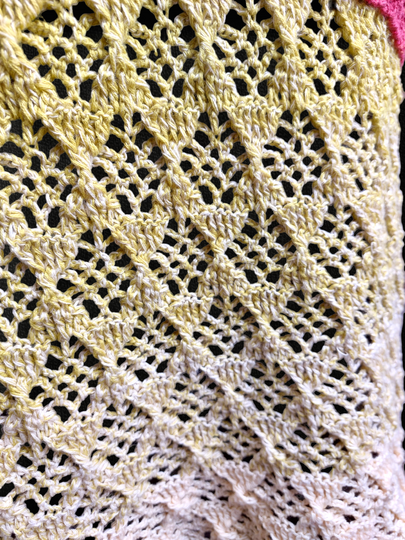 The instruction is written in great detail on 14 pages. The pattern is actually just 6 different rows and then shifted 5 stitches - it's very easy if you know the following stitches and techniques:
