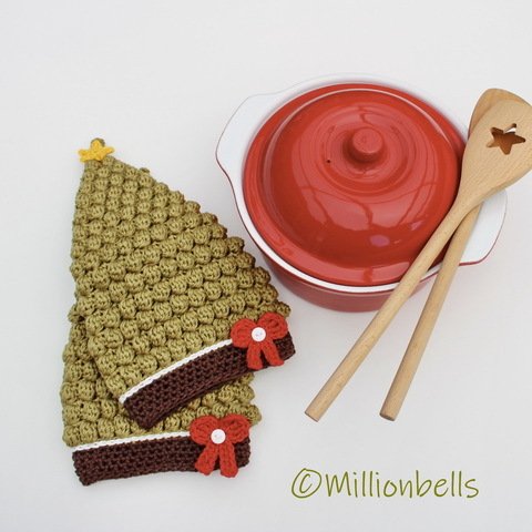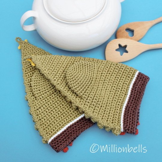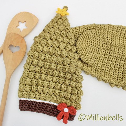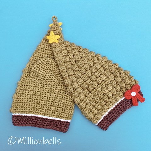 This pattern (US terms) will guide you to crochet a set of Christmas Tree oven mitts as shown in pictures, made using sport weight cotton yarn and crochet hook G (4 mm). They will be made by working 2 strands of yarn, held together.