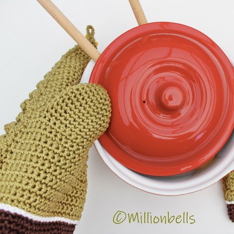 Cotton yarn by Scheepjes Catona was used to create the oven mitts in the pictures.