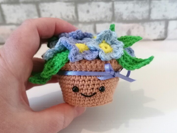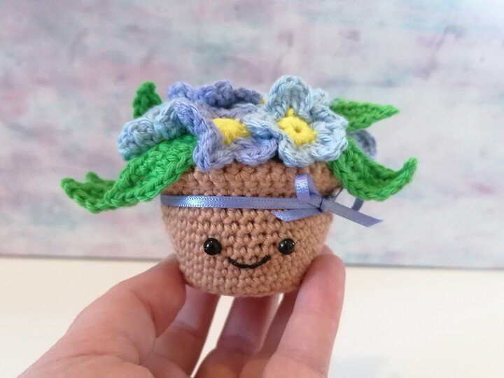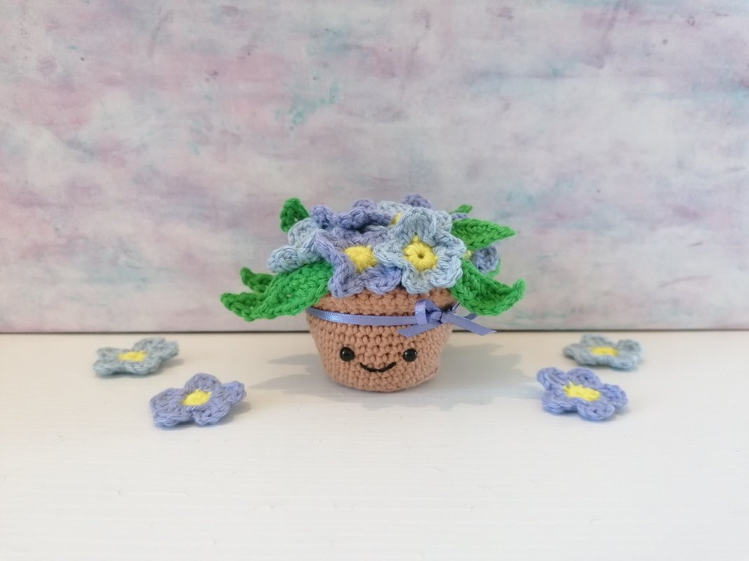 Bring joy and color into your space with this adorable amigurumi pattern – a tiny flower pot full of forget-me-nots with a cheerful little face.