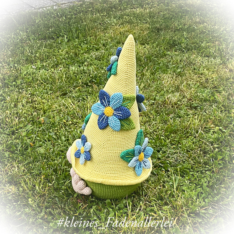 Who hasn't always wanted a gnome in their house, and if it can also stop doors from slamming, what more could you want? This pattern includes the basic pattern for the doorstop ball and the supplementary pattern for the spring gnome, whose hat is covered in flowers. Both are crocheted with cotton yarn (125m~50g.) and a 3mm needle. The entire doorstop is about 40cm tall, depending on the yarn used, needle size and crochet strength, and weighs about 1400g.