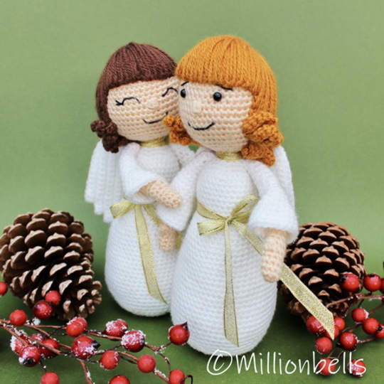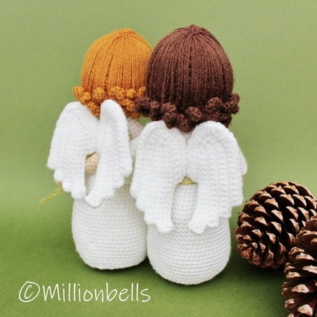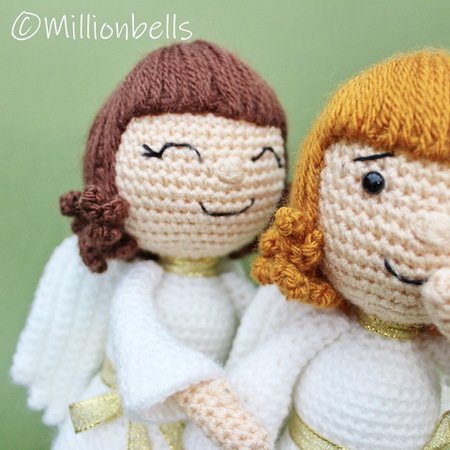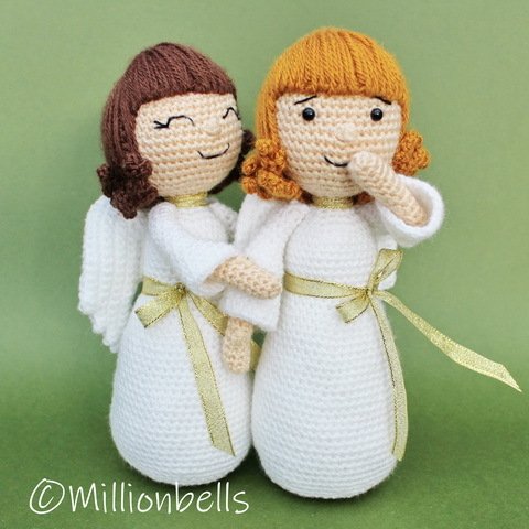 This pattern (US terminology) will guide you to crochet an adorable amigurumi angel as shown in pictures, made using soft acrylic 8 ply/DK yarn and crochet hook E (3,5 mm). Finished size will be approx. 9” (23 cm) tall. The angel’s head and body are crocheted together as 1 part.