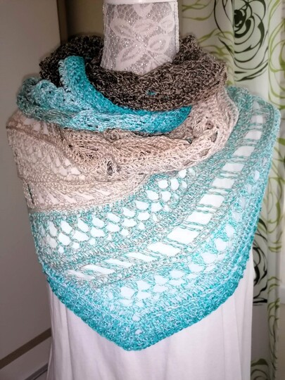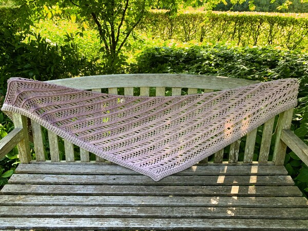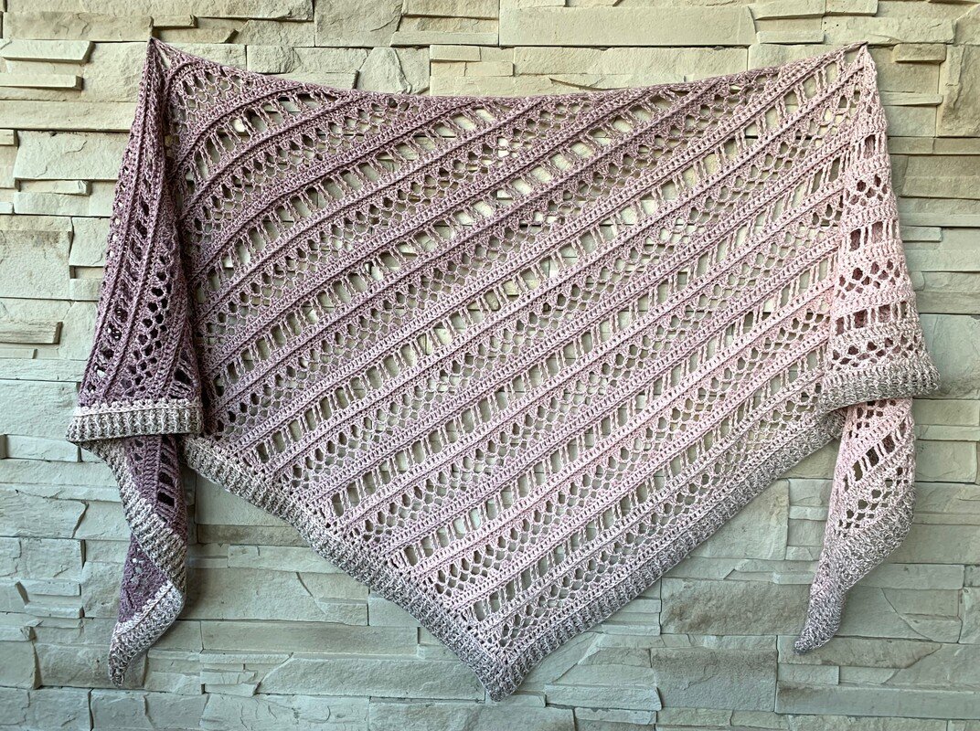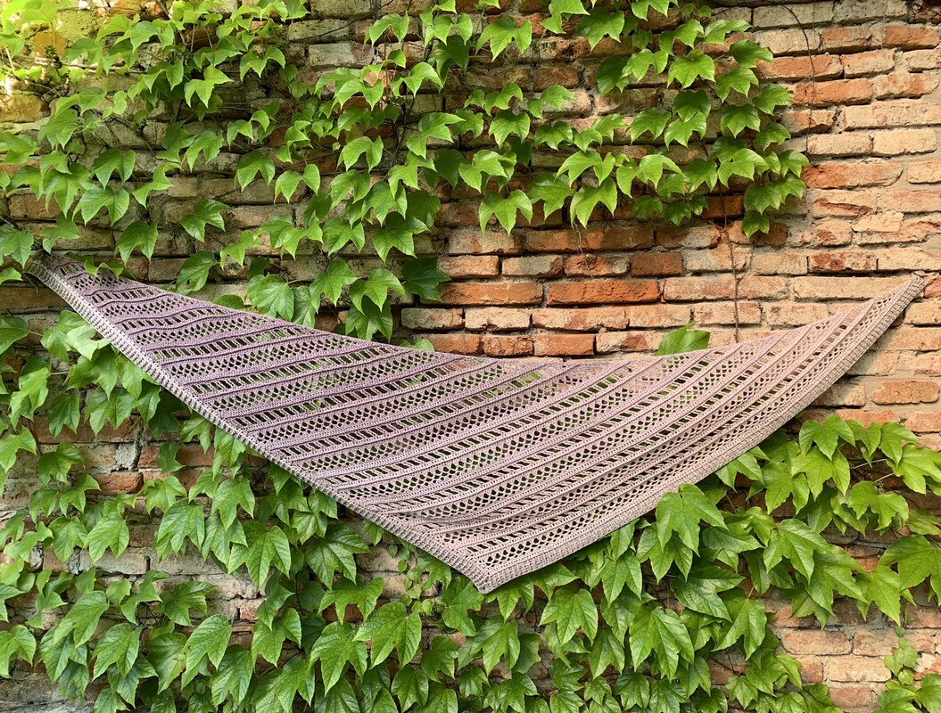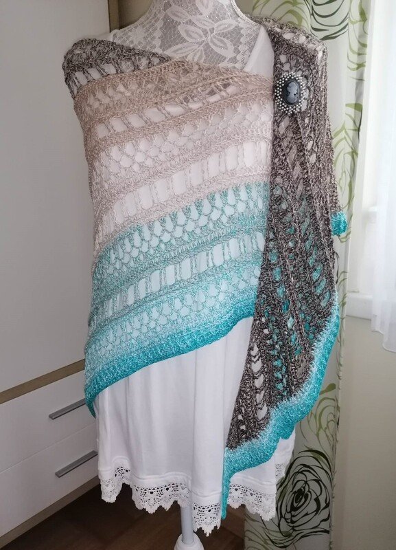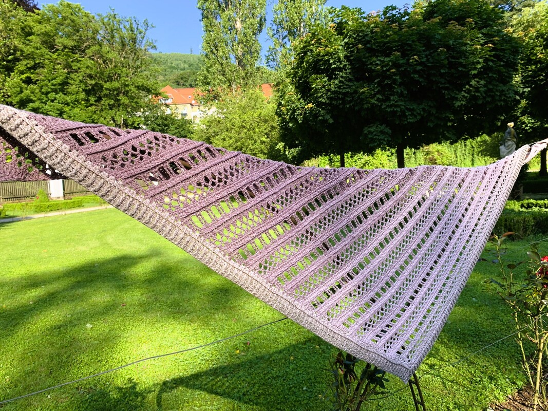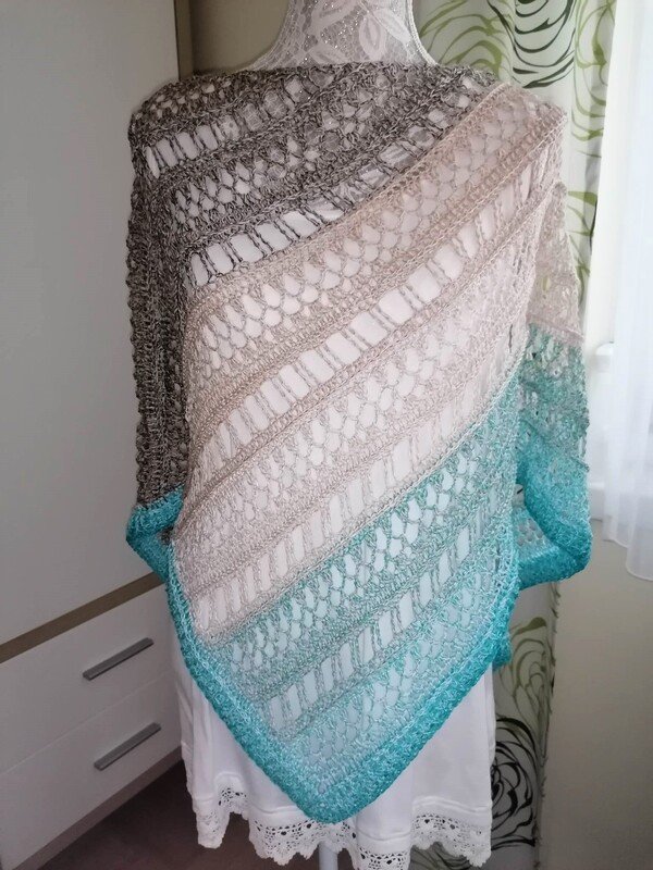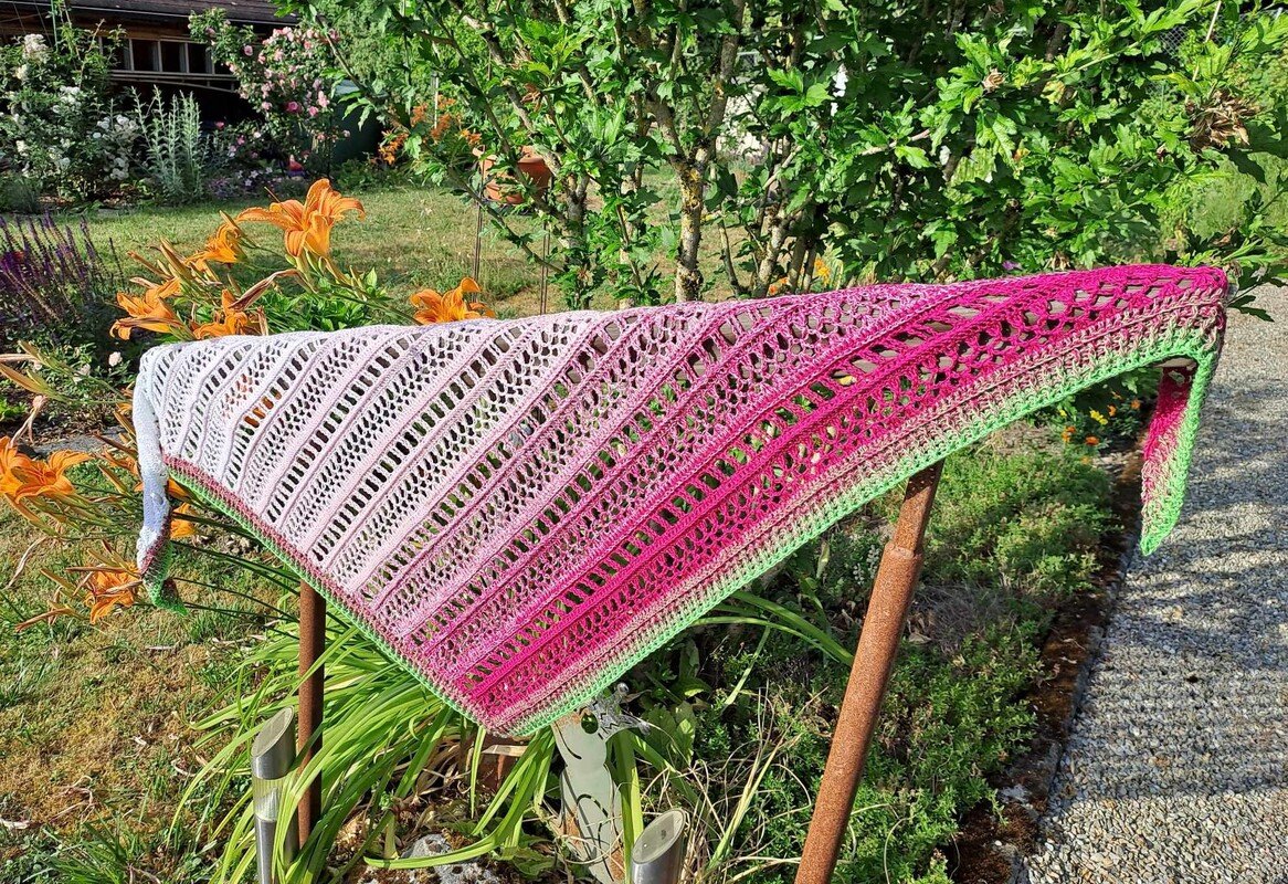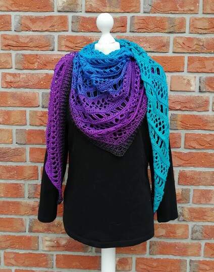 The flat triangular scarf "Delia" is a loose and airy scarf that can be crocheted in any size. It is ideal for the summer, and can be crocheted very fast.