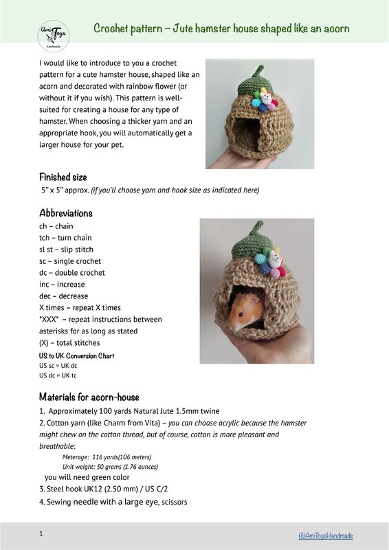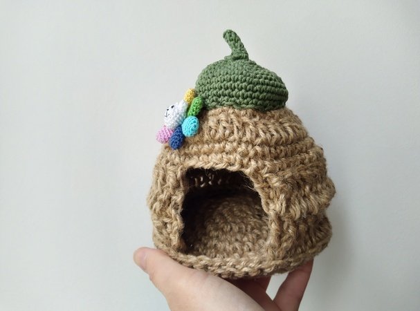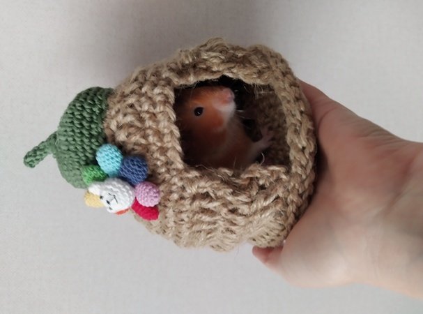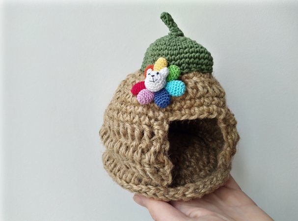 I would like to introduce to you a crochet pattern for a cute hamster house, shaped like an acorn and decorated with rainbow flower (or without it if you wish).