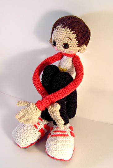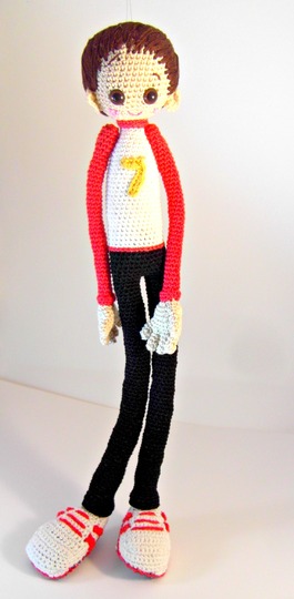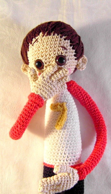Dani ist ungefähr 19 cm groß und aus Baumwollgarn. Um ihn zu häkeln, braucht man außer dem Garn auch eine Polystyrol Kugel mit einem Durchmesser von 6 cm, 12mm Tieraugen, 2mm - und 1.25mm Häkelnadeln, eine Schere, Klebeband, Jeansstoffreste und ein Stück Pappe.
