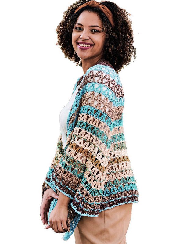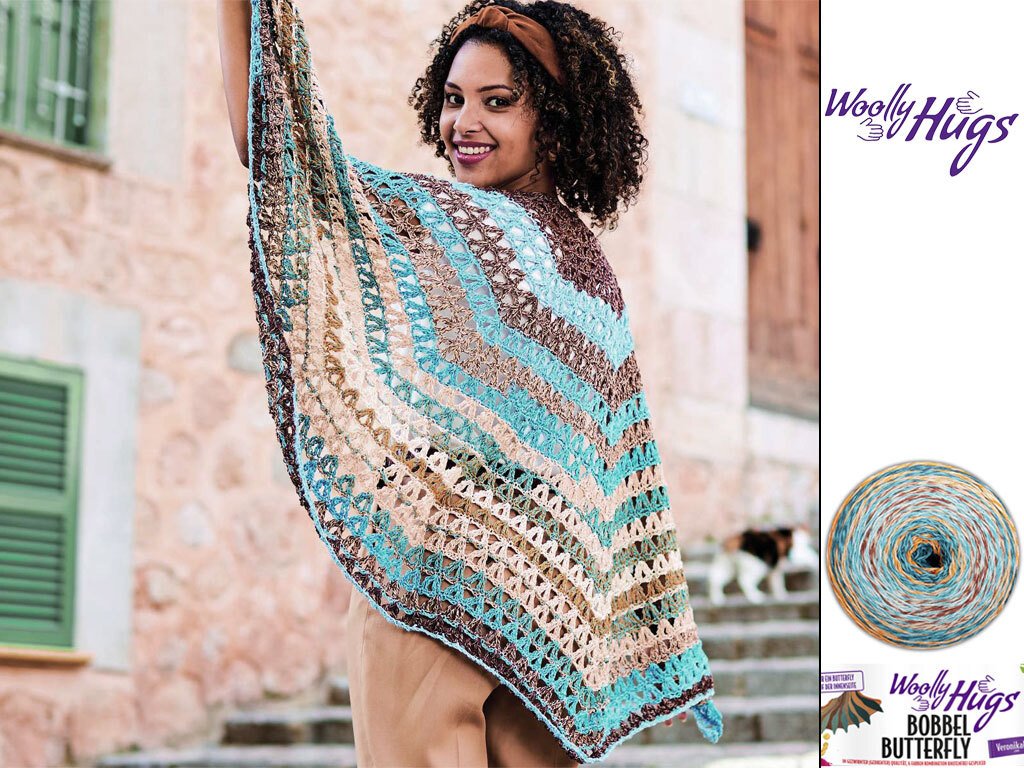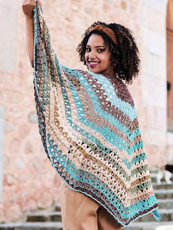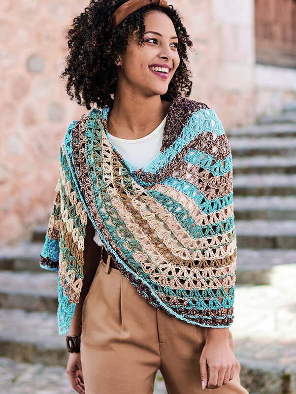 Dieses Tuch ist ein muss für den Sommer, denn egal ob ein leichter Sonnenschutz am Strand oder Abends wenn es kühler wird - das Tuch gehört immer dazu. Es wird mit zwei Spitzen gehäkelt, sodass es fast halbrund wirkt. Das große luftige Muster passt gut zu den Streifen die durch das Garn ganz von alleine entstehen und super schnell von der Hand gehen. Hier wechseln sich Hell- bis Dunkelbraune und Türkisfarbene Streifen ab.
