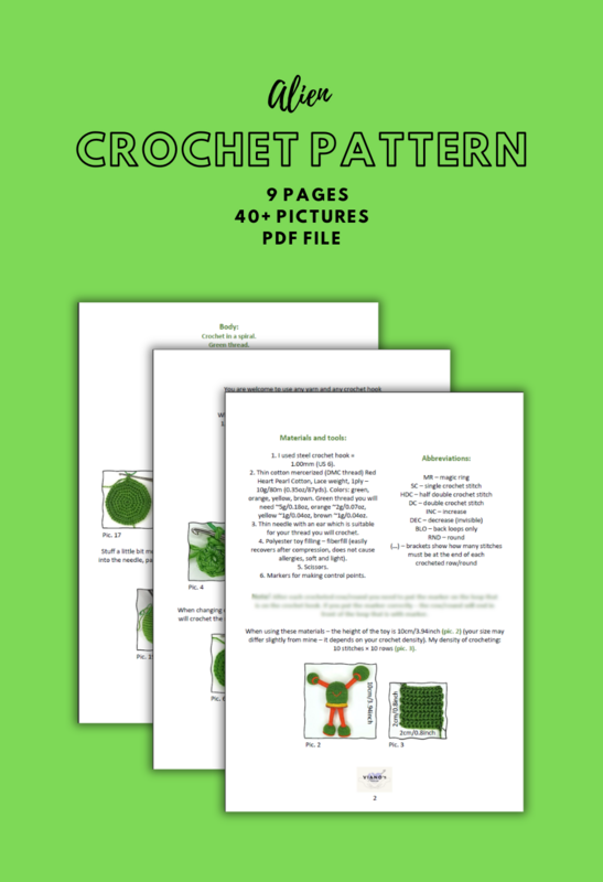 The pattern is for your personal use only. It is not allowed to share information and photos from this pattern without mentioning or permission of the author. You can sell small quantities of the Aliens you made with this pattern!