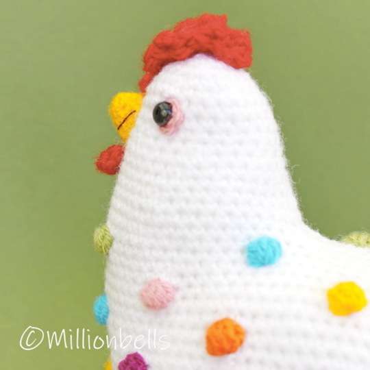 This pattern describes in US terms how to crochet a sweet amigurumi chicken with colorful Polka Dots as shown in pictures. The pattern is worked in continuous rounds.