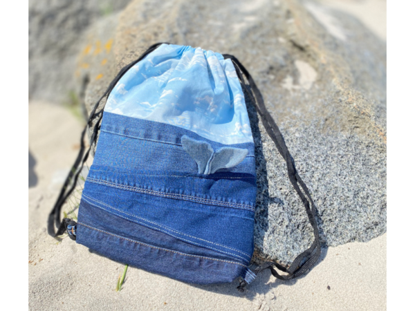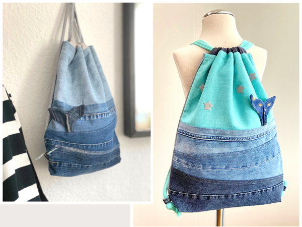Learn how to make a drawstring backpack from old jeans. Learn everything important about jeans upcycling. Use the finished side seams of the jeans.