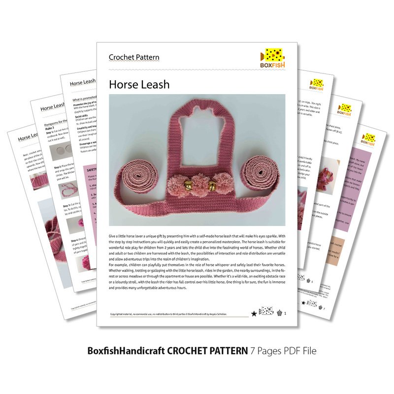 In the pattern you get a list of materials that you need to crochet for the horse leash, a list of abbreviations for the crochet diagram used and especially the crochet diagrams the horse leash itself. The individual steps are described in detail and lots of pictures also again clarify the individual steps. So you can start crocheting right away and bring your own horse leash to life.