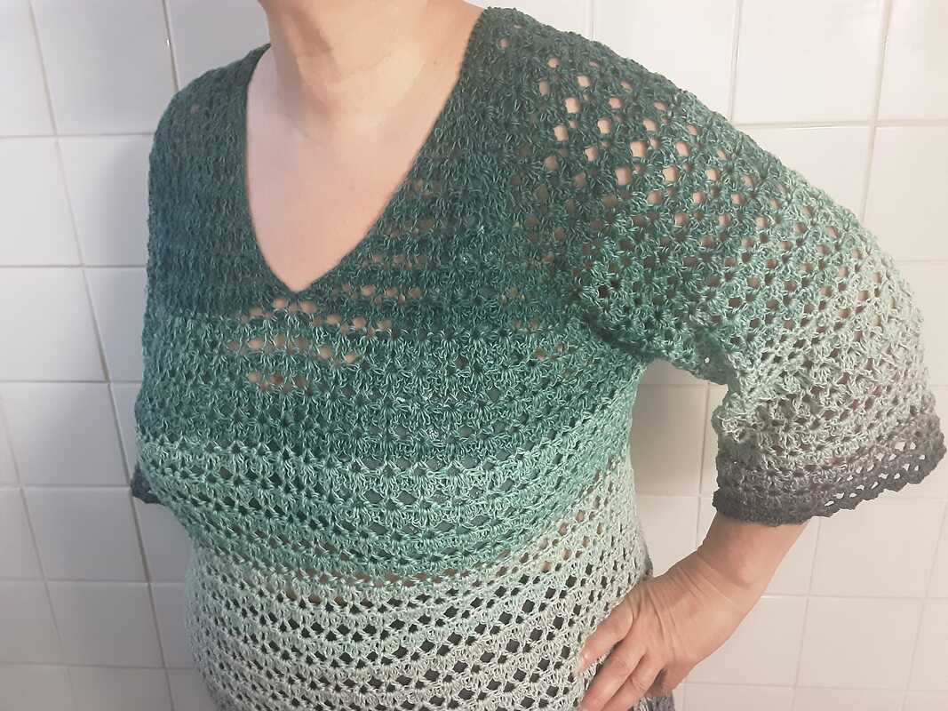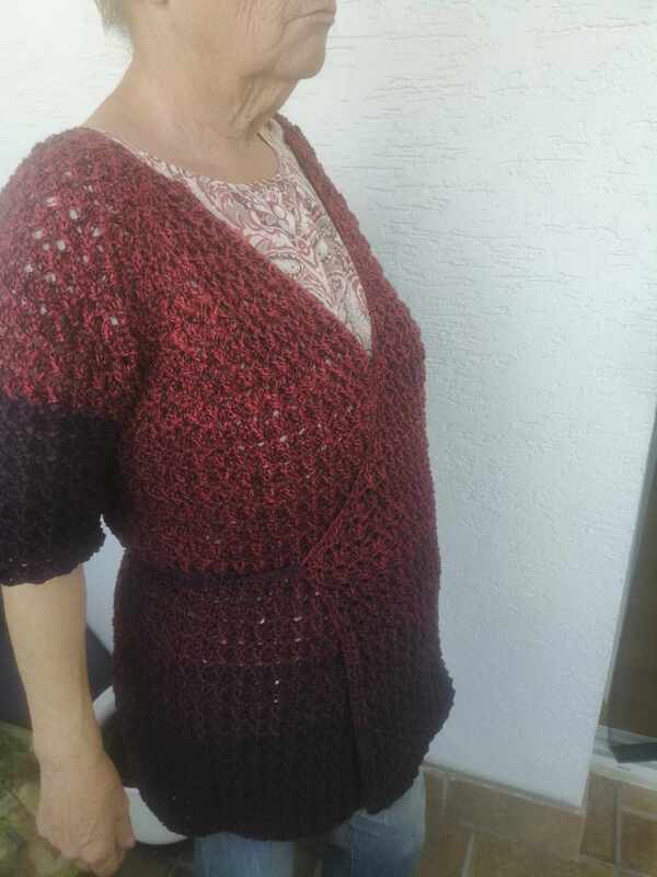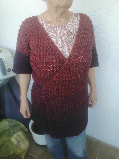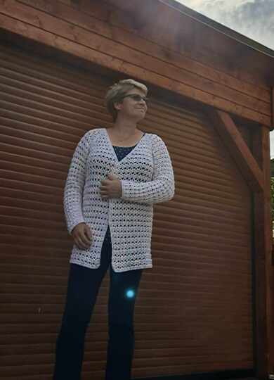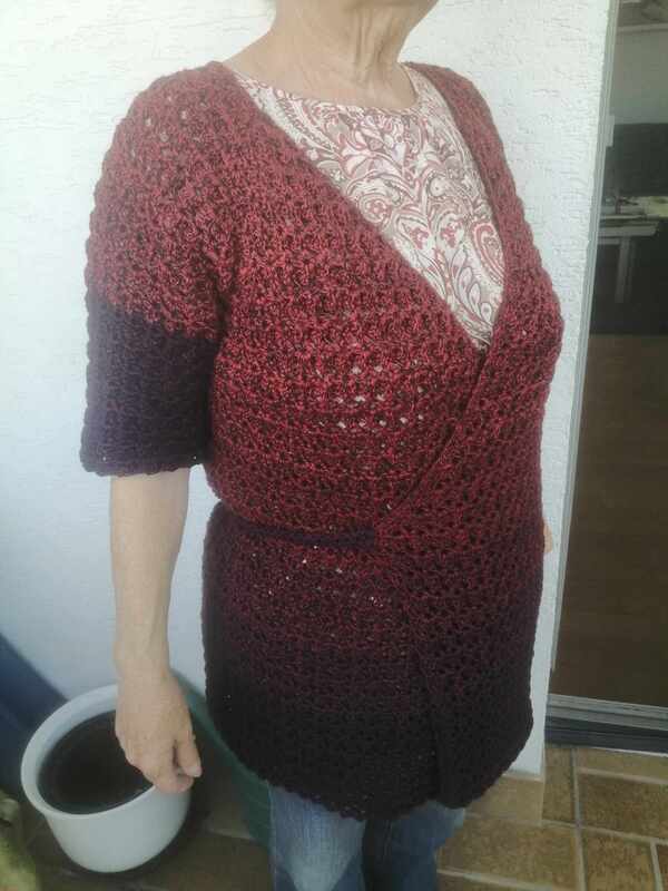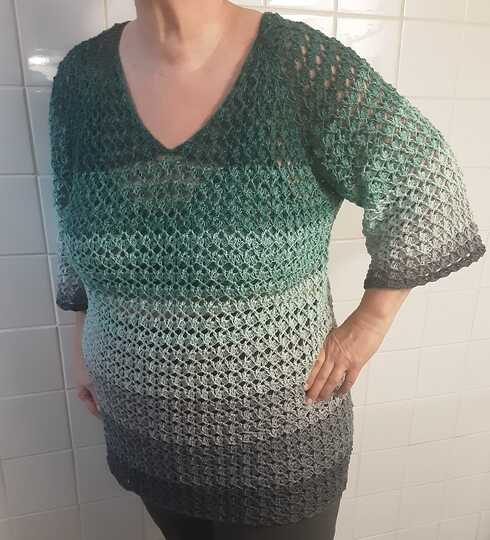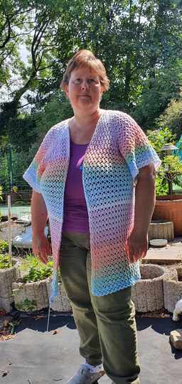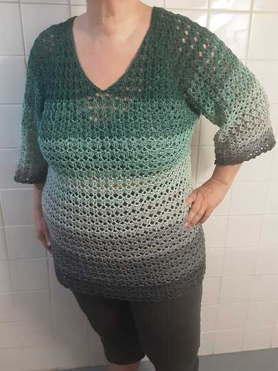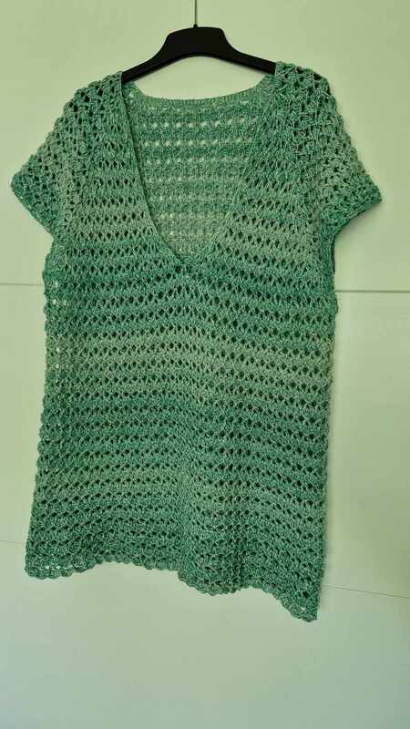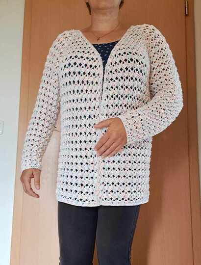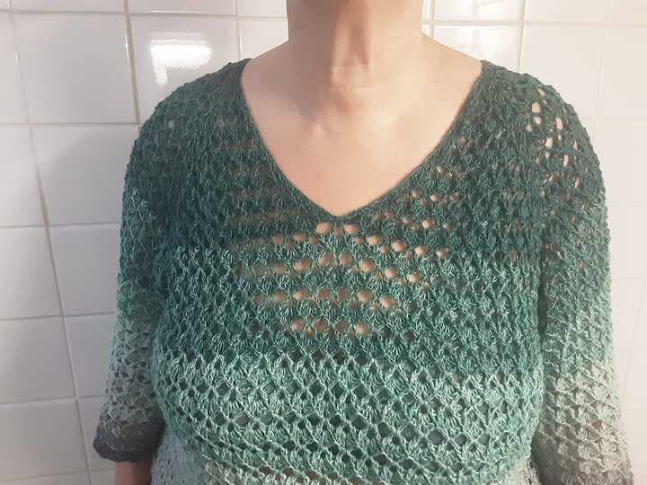 Schließlich meinten meine Tesster, dass man daraus auch eine hübsche Jacke machen kann. Durch den V-Ausschnitt hat man auch da die Wahl, ob man die Jacke gerade runter, oder gar als Wickeljacke häkelt. auch hier gilt, das Muster kann auch gewendet getragn werden.