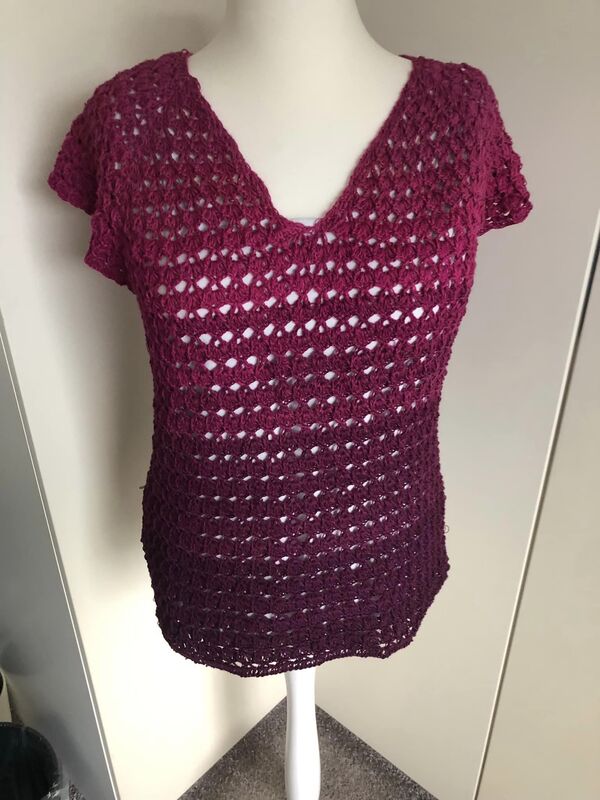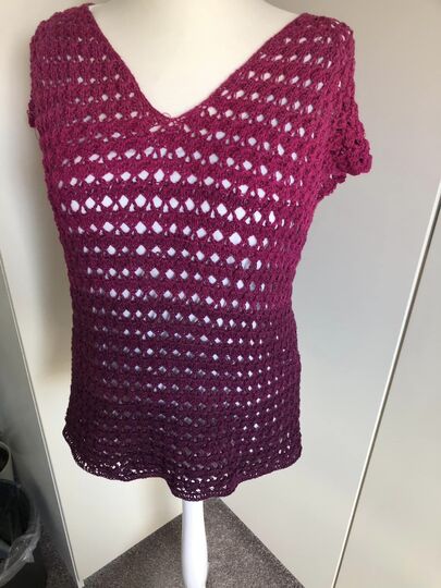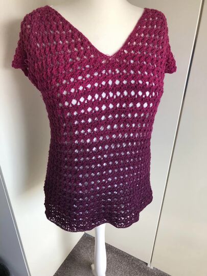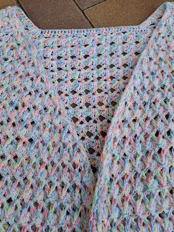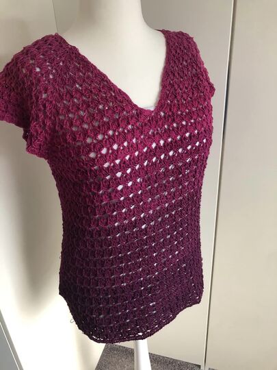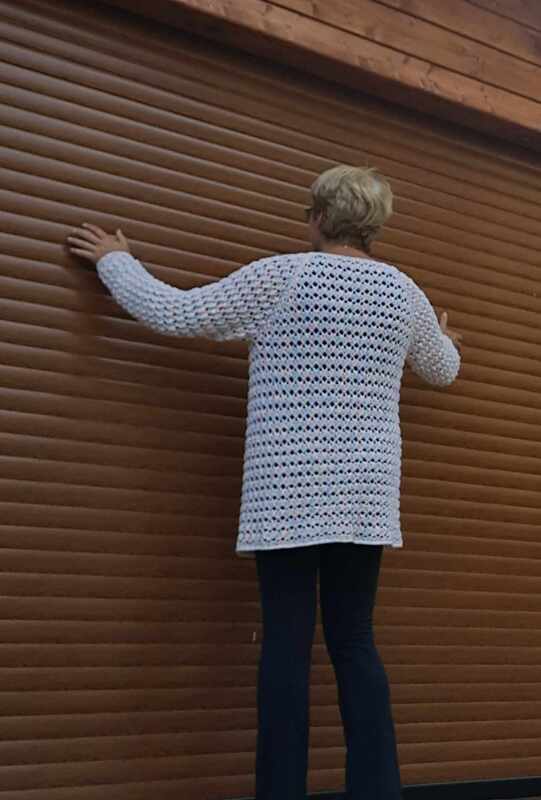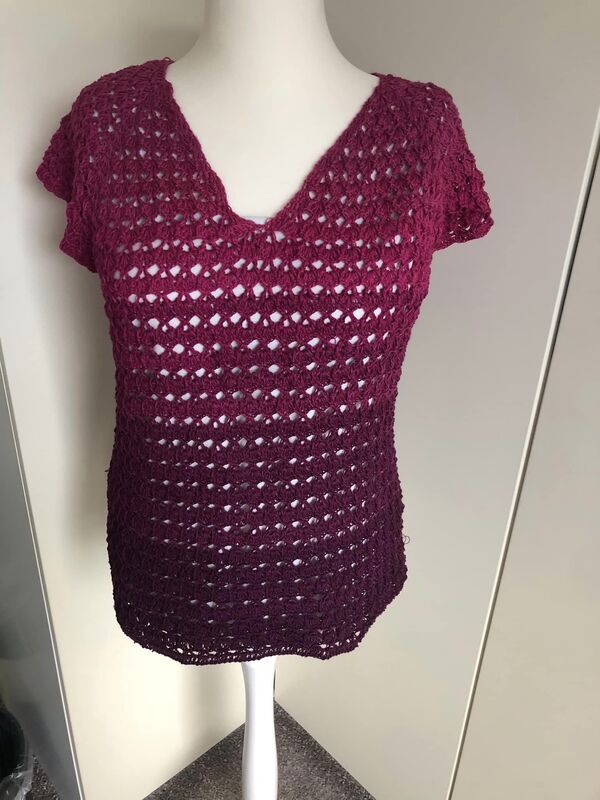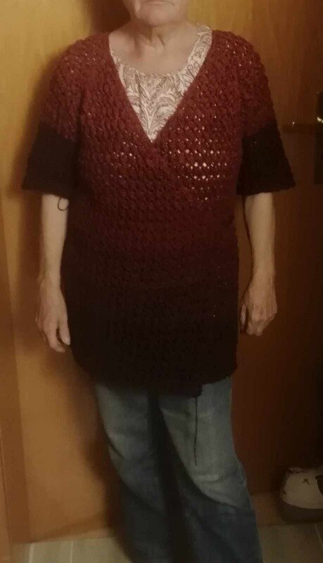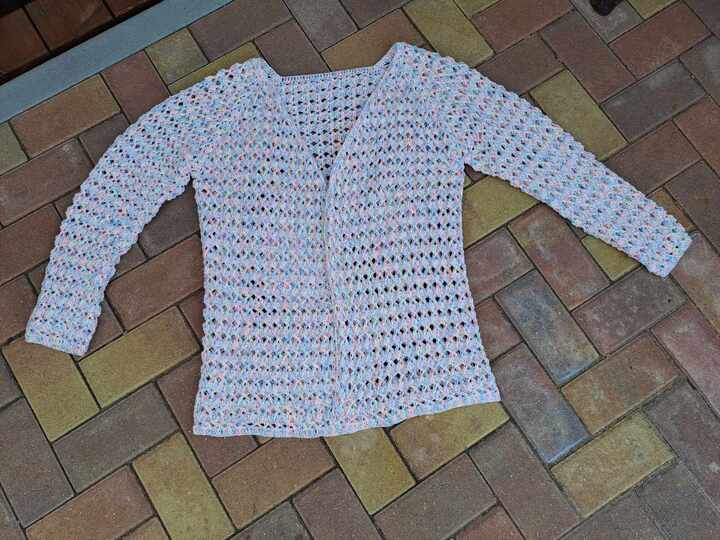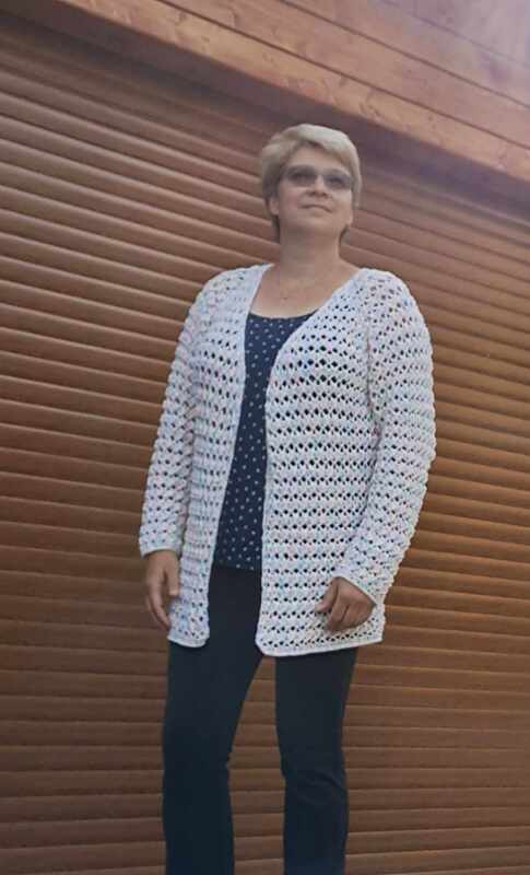 Schließlich meinten meine Tesster, dass man daraus auch eine hübsche Jacke machen kann. Durch den V-Ausschnitt hat man auch da die Wahl, ob man die Jacke gerade runter, oder gar als Wickeljacke häkelt. auch hier gilt, das Muster kann auch gewendet getragn werden.