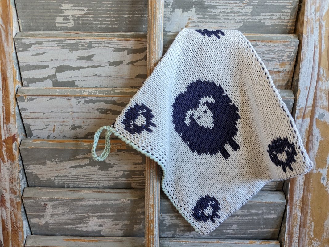 The potholder / washcloth is worked in the double knitting technique. How you get two different sides, so that the sheep appear from the front on the front side and from behind on the back side, is explained in the patttern.