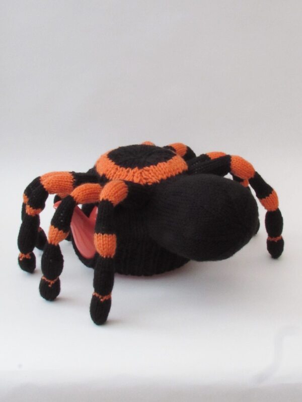 When you think of a tarantula, I think that we probably image the black and orange one, which is the Mexican Redkee tarantula. So I chose to base the tea cosy on that species, and the colours are appropriate for Halloween and autumn. I thought the lovely orangey knees would look more effective than a plain black house spider.