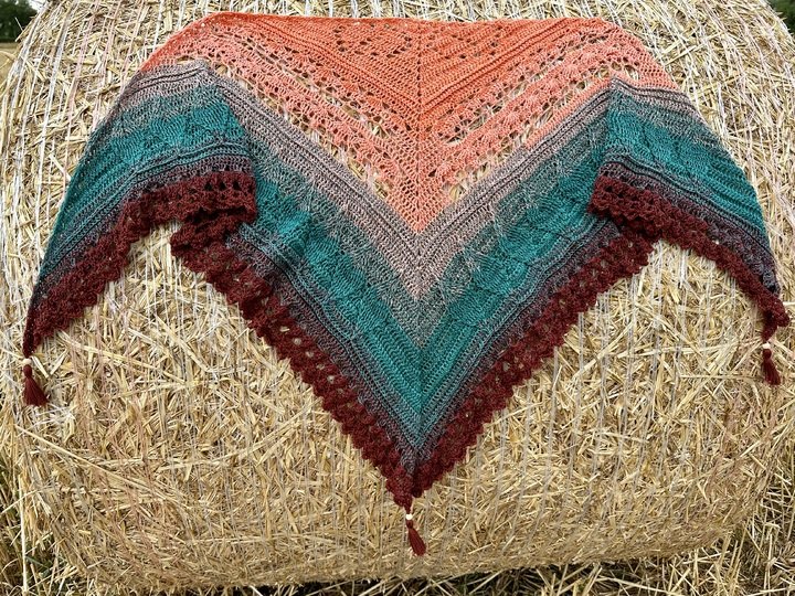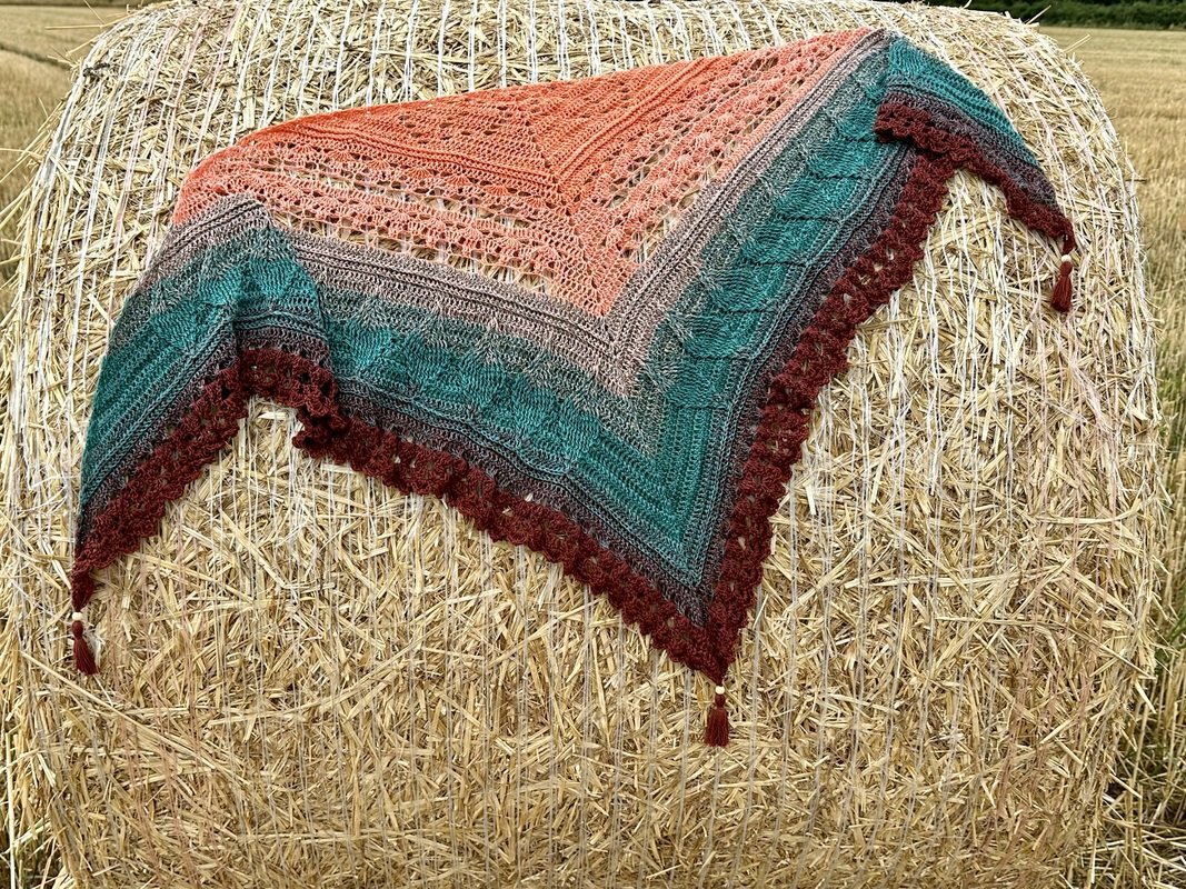 Mein Tuch habe ich mit einem 3-fädigen/1.000m Bobbel und NS 3,5 gehäkelt. Es hat eine Spannweite von 1,75m und eine Tiefe von 0,73m.