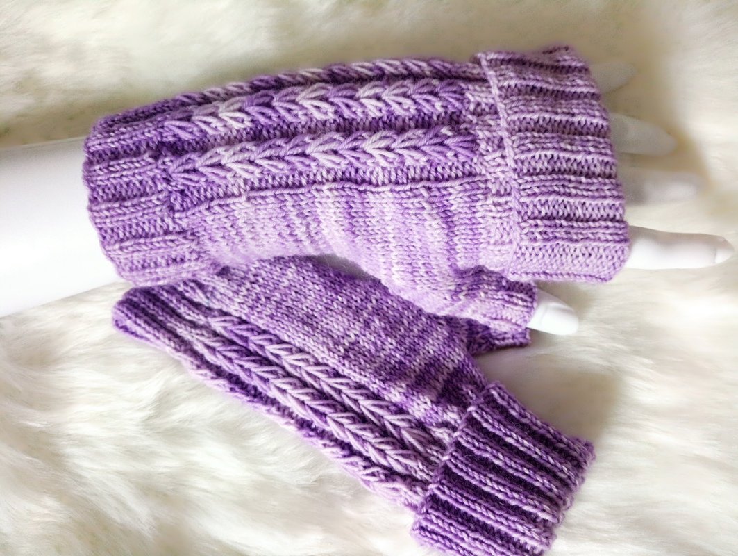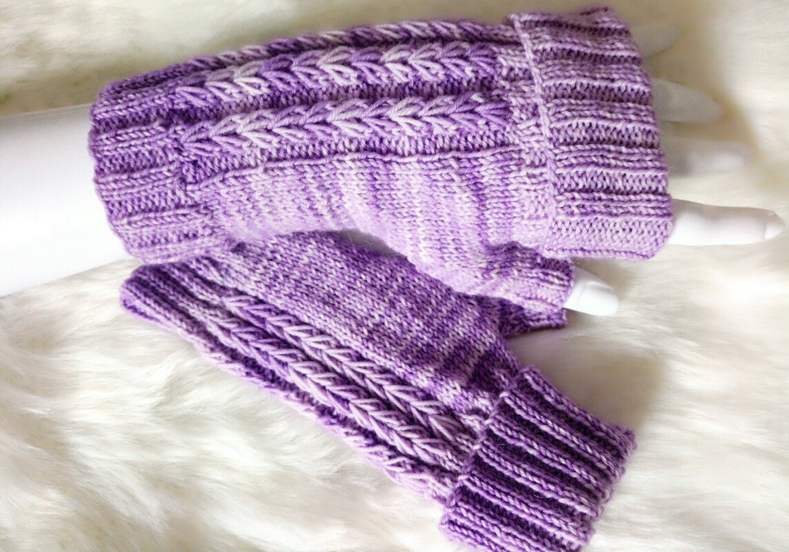 Ganz einfach in Reihen gestrickte Handstulpen mit einem falschen Zopfmuster, das an aneindergereihte Herzen erinnert.