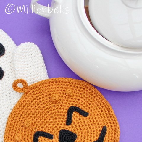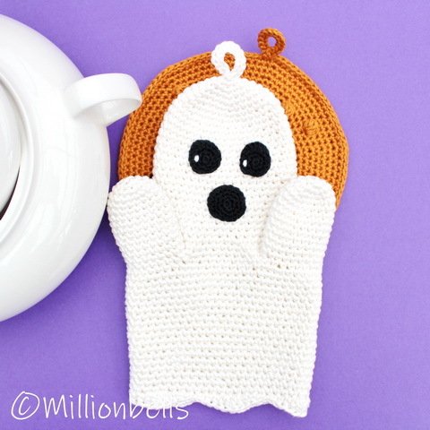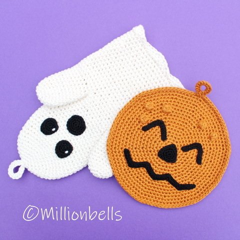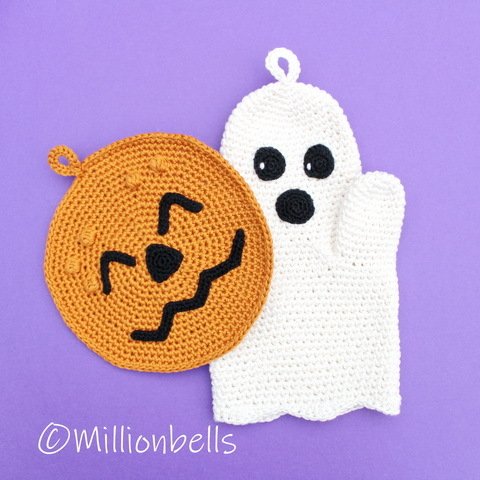This PDF crochet pattern (US terms) will guide you to crochet a lovely set of a ghost oven mitt and a pumpkin potholder as shown in pictures, made using sport weight cotton yarn and crochet hook G (4 mm). They will be made by working 2 strands of yarn, held together. The facial features will be made by working 1 strand of yarn and crochet hook C (2.5 mm). Due to the original design, the oven mitt is suitable for your right hand, as well as for your left hand.