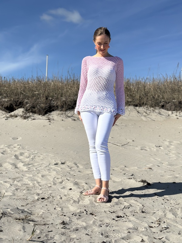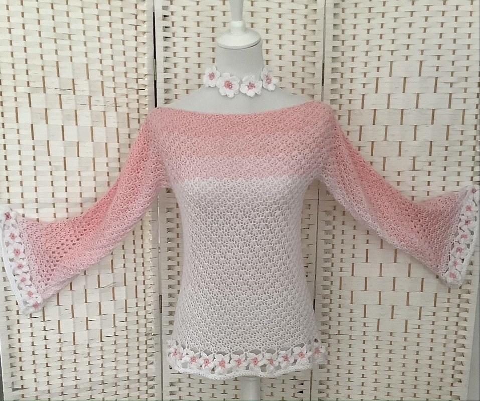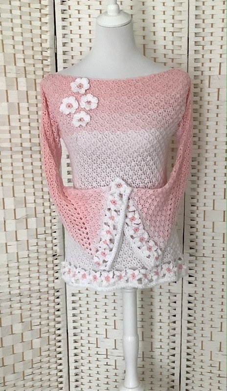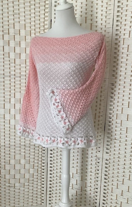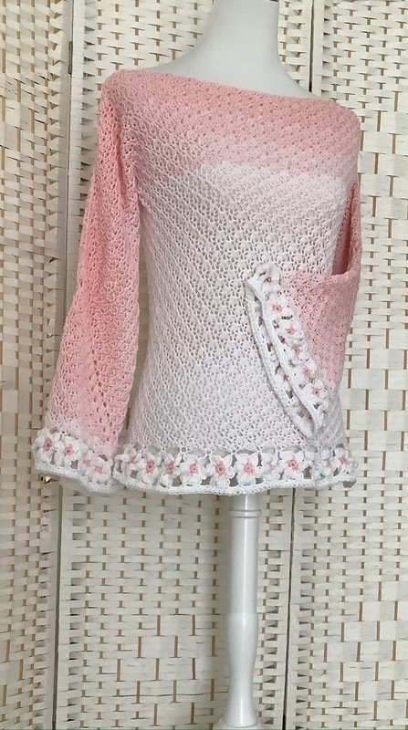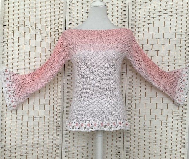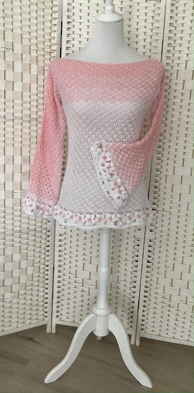 Der schöne Pullover ist an jede Größe anpassbar und für nahezu jedes Garn geeignet. Durch die Blumen und das ganz besondere Muster verwandelt er sich bei jeder Figur zum echten Hingucker. Die Blumenborte ist optional und kann natürlich auch je nach Geschmack weggelassen werden.