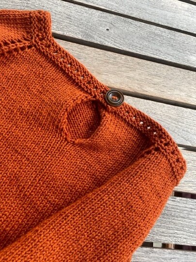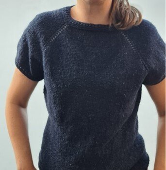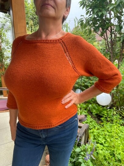 The T-shirt with the raglan construction is knit top down and seamless in one piece. At the back there is a beautiful teardrop neckline with a button.