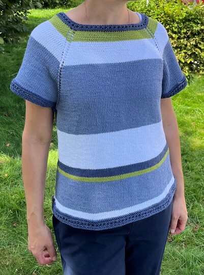 It is all in the details, like the stylish lace pattern, which adorns this easy-to-knit T-shirt on the cuffs and along the raglan line.