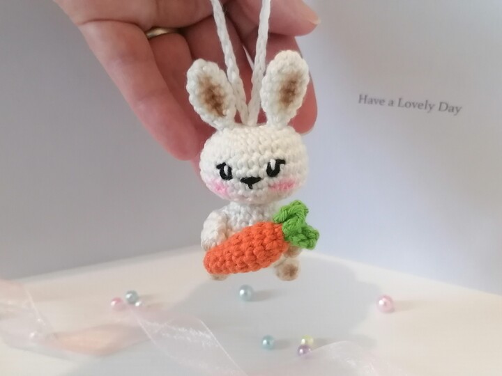 This pattern does not teach the basics of crochet. This crochet pattern consists only of written instructions and how-to photos that explain how to crochet an amigurumi keychain bunny with carrot.
