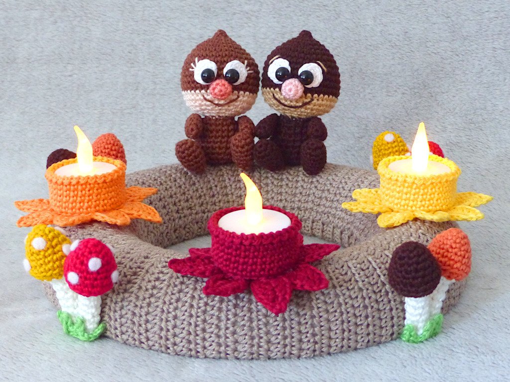 In this pattern I explain to you how to crochet the wreath, the hazelnuts, the tealight holders and the mushrooms.