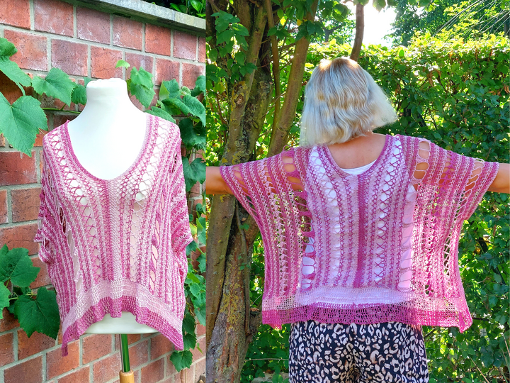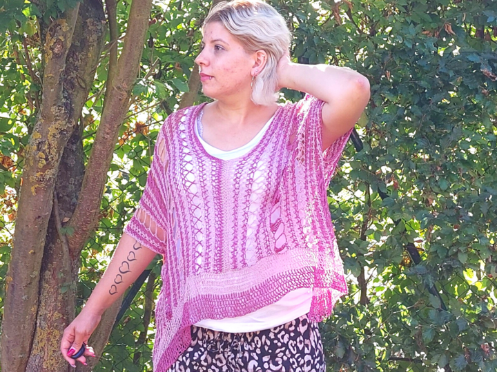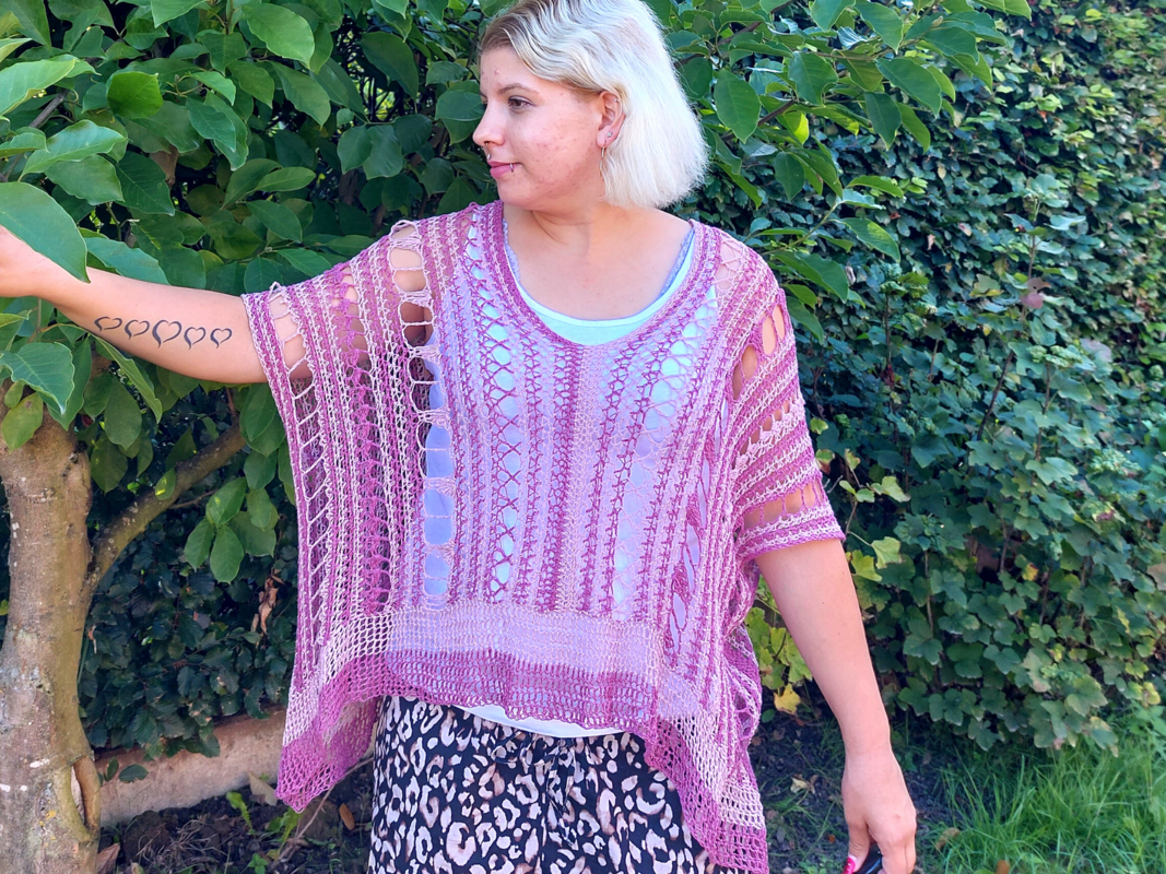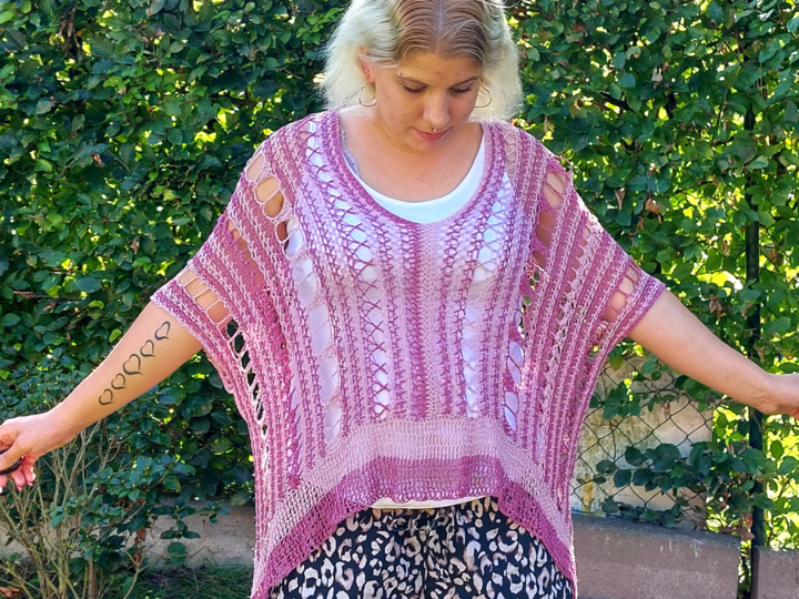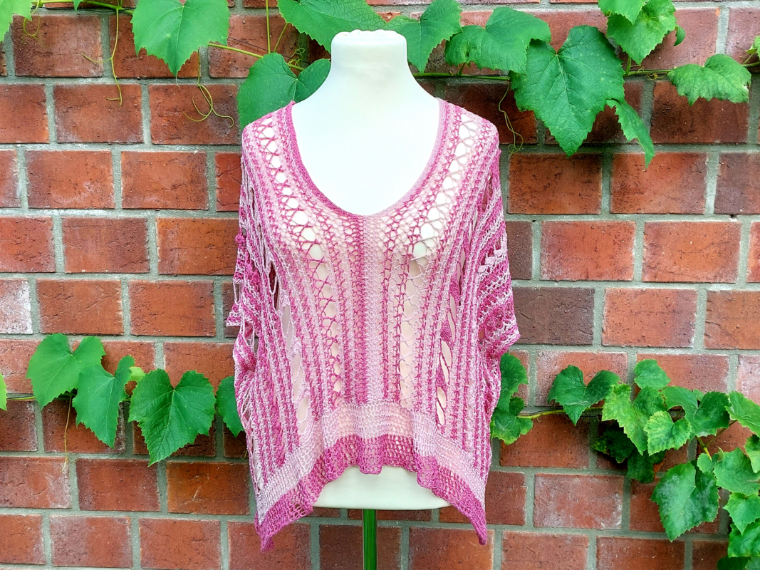 You can crochet the shirt with every thin yarn (fingering weight or below). You don’t need a gauge swatch, because it is adapted to your individual body measure. The quantity named below is for an airy shirt in size M (see pictures). For smaller or bigger sizes you have to adapt the yarn quantity. Also the needle size must be adapted to the used yarn. I used a bigger needle size than it was indicated for the yarn to get a very airy texture of the shirt.