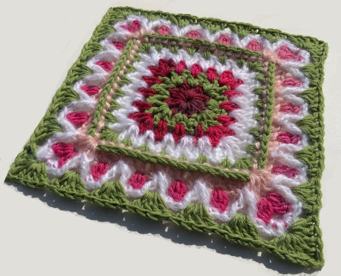 Das fertige Wiesngranny hat bei 9 RUNDEN eine Seitenlänge von 26 cm + wiegt 25 Gramm