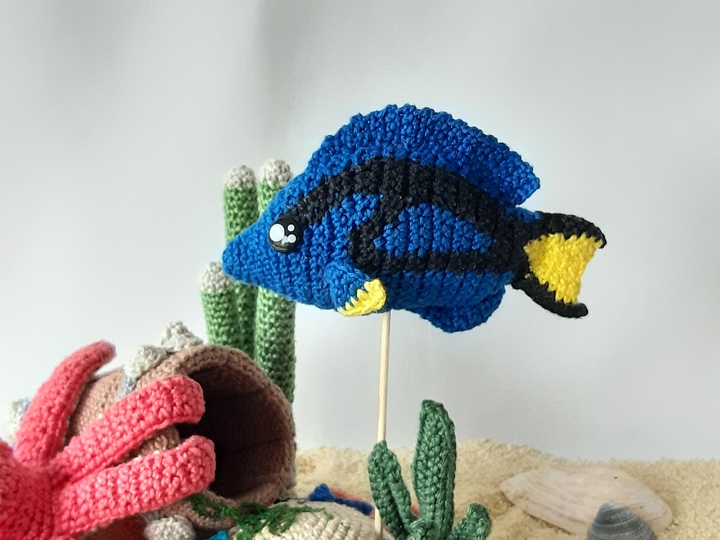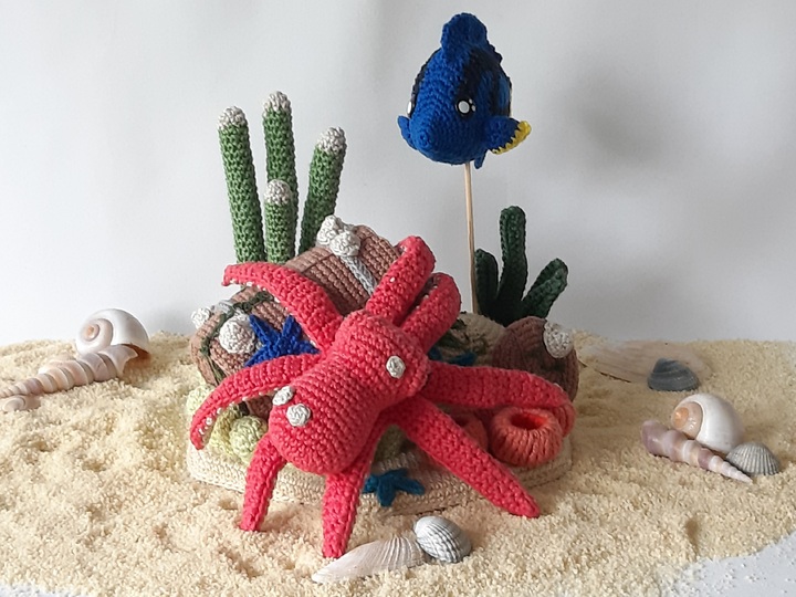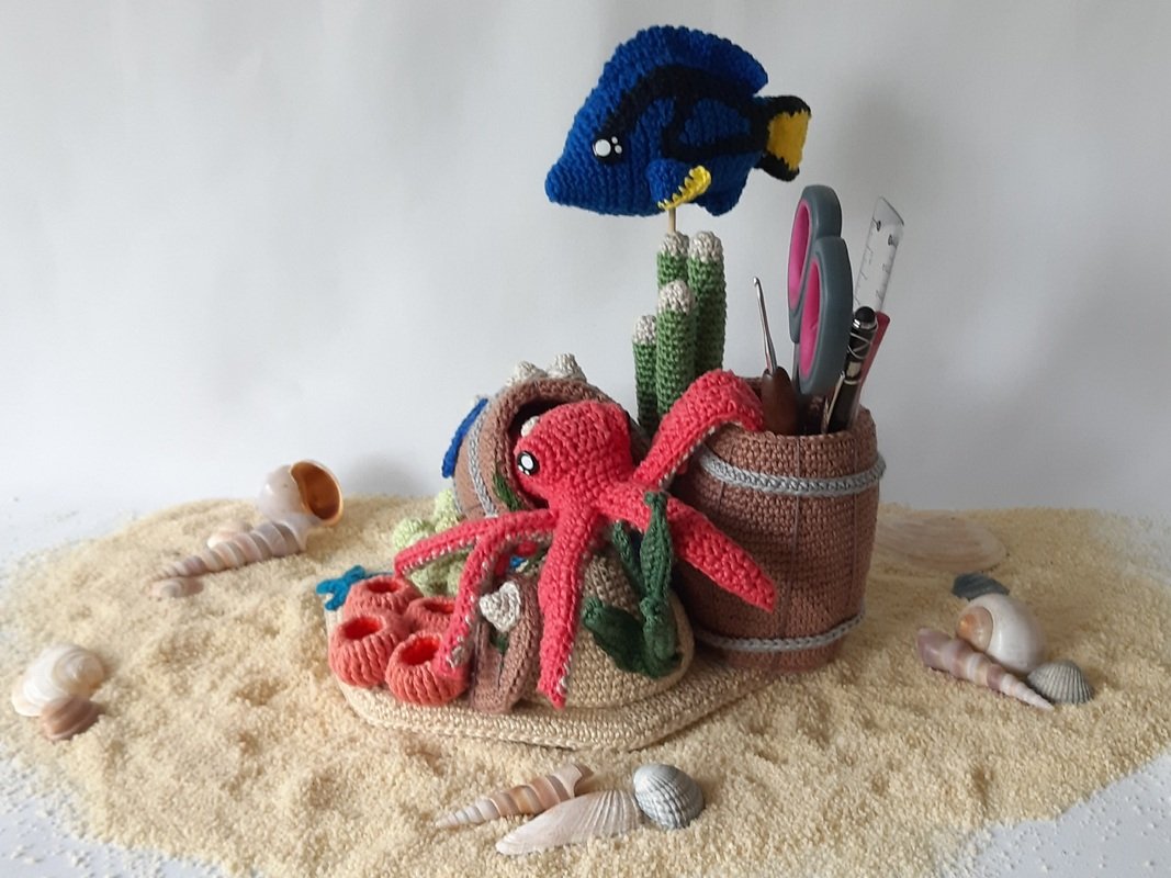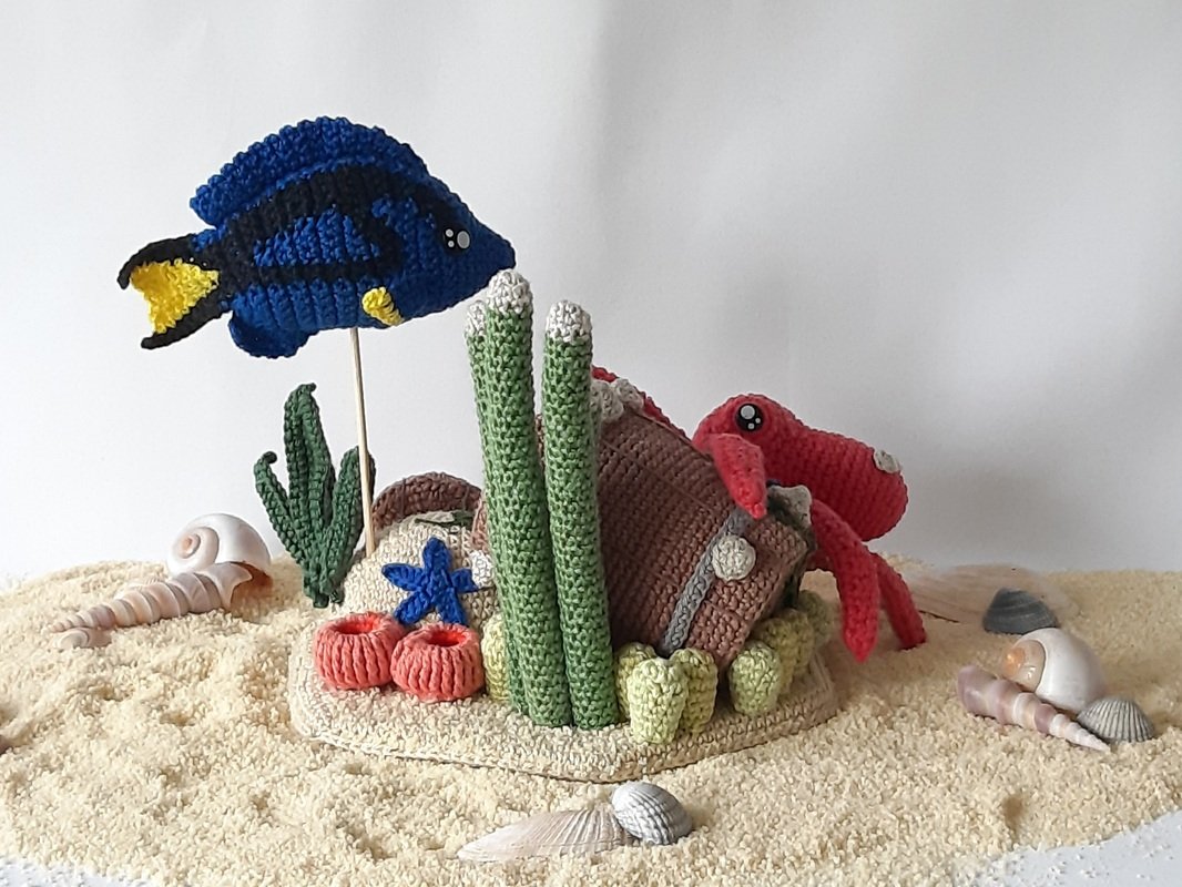 The pdf includes the pattern for the underwaterworld with the base and stone, the corals (thimbles, pyramides and bowls) and mini-sea stars,the barrel, the algae and sea weeds and the sea dwellers octopus Olivier and surgeon fish Dion;