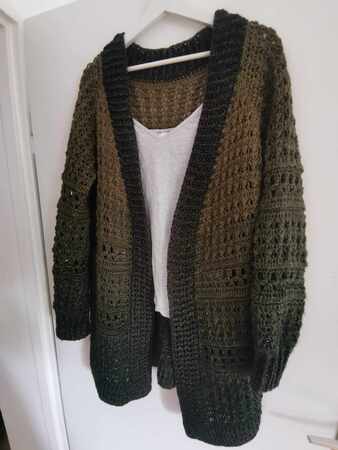 Je nach Garnverfügbarkeit und Wunsch kann sie von Bolerolänge bis hin zum Kurzmantel gehäkelt werden.