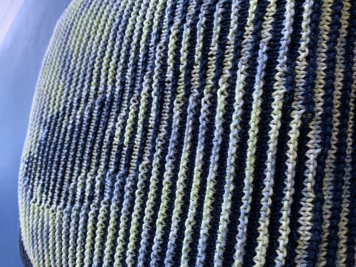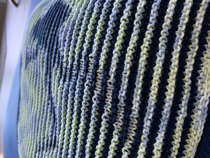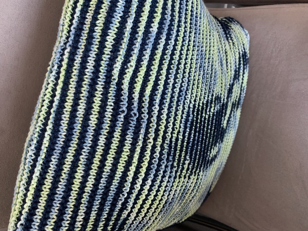 The technique of illusion or shadow knitting is very fascinating. If you look directly at the piece of knitting, all you see are stripes. However, if you look flat over the piece of knitting, you can see the image or pattern.