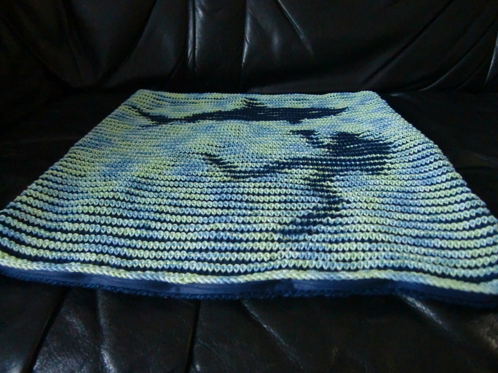 This pillow case is a great gift for divers. One side shows a diver in a cave, the other a diver with a shark. The cushion is knitted in one piece, but it is also possible to knit the two motifs separately and then sew them together.