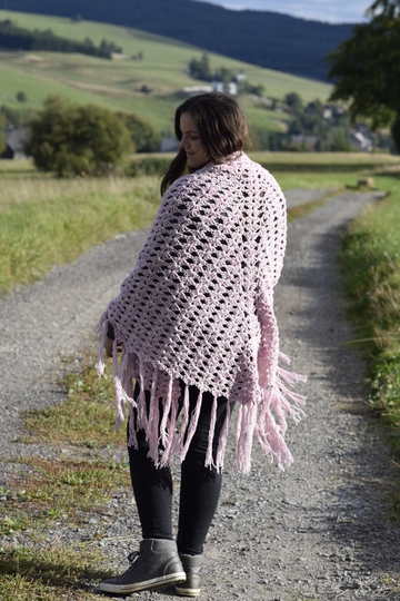 Das halbrunde Tuch ist mit dicker Wolle und großer Nadel schnell gehäkelt und das Muster schnell gelernt. Du kannst es beliebig fortsetzen und kleiner oder größer arbeiten. Das hier verwendete Garn hat eine schöne melierte Struktur und gibt der Stola einen tollen kernigen Look. Ich habe dir ein Komplettset zusammengestellt mit dem du gleich loslegen kannst. Es ist aus einem Alpaka-Polyacrylgemisch, wodurch es mega kuschlig und trotzdem im Wollwaschgang waschbar ist. Du kannst aber auch mit jedem anderen Material deiner Wahl arbeiten.