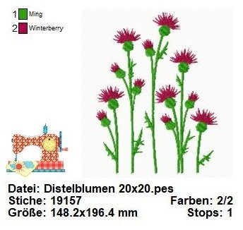 Diese Stickdatei präsentiert einen prächtigen Strauß von Disteln, der sowohl rustikale Schönheit als auch eine gewisse Wildheit ausstrahlt. Die Disteln sind detailliert und realistisch gestaltet, mit ihren charakteristischen stacheligen Blättern und kugelförmigen Blüten in einem tiefen Altrosa. Der Strauß ist üppig und voll, was eine starke visuelle Wirkung erzeugt.