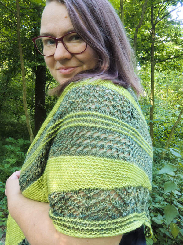 The shawl Libelle (means dragonfly in english) is a simple yet striking shawl. It consists of a mix of short rows and lace patterns. It requires only 200g of yarn, or approximately 800m. So, one skein per color in fingering/sock weight.
