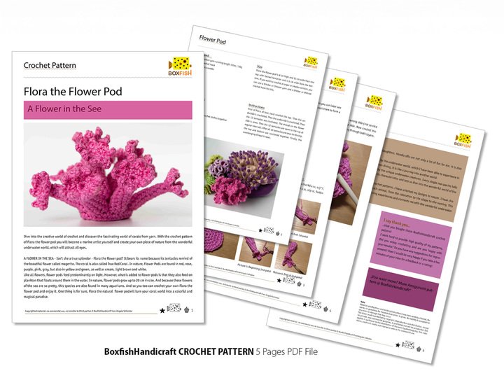 Dive into the creative world of crochet and discover the fascinating world of corals from yarn. With the crochet pattern of Flora the flower pod you will become a marine artist yourself and create your own piece of nature from the wonderful underwater world, which will attract all eyes.