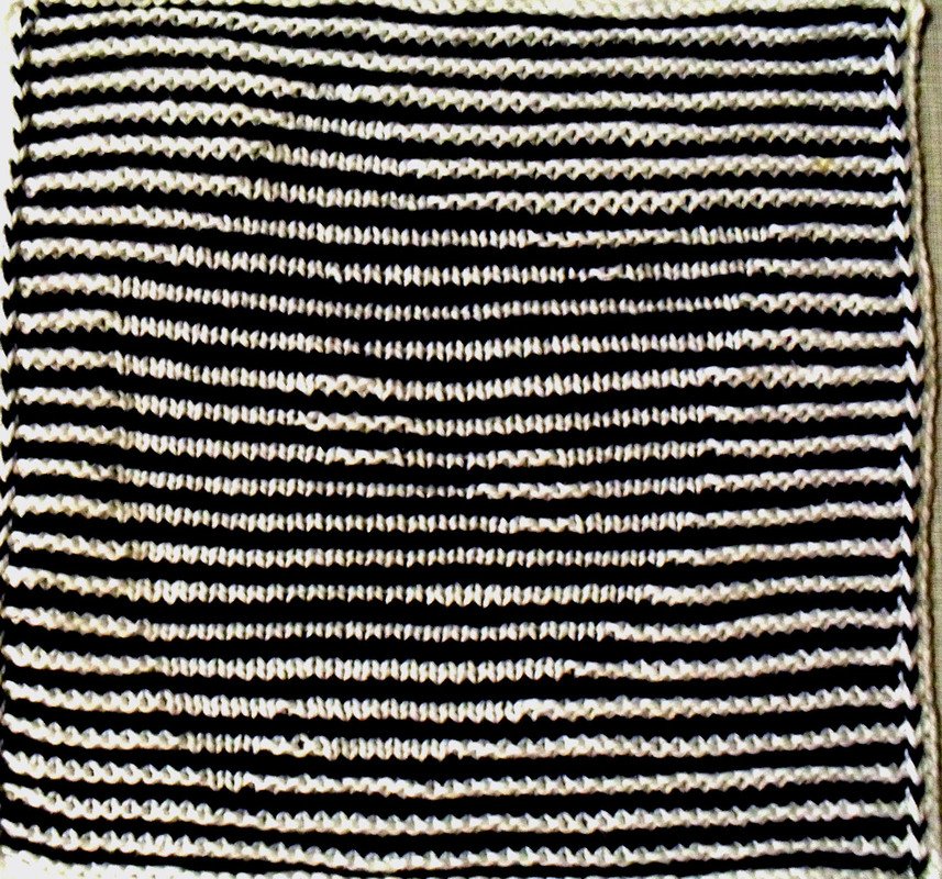 Benötigt wird Baumwollgarn in zwei Farben, gesamt ca. 40 Gramm, Nadelstärke 2 1/2 oder 3, je nach Material und Strickweise, es muß sehr fest gestrickt werden!