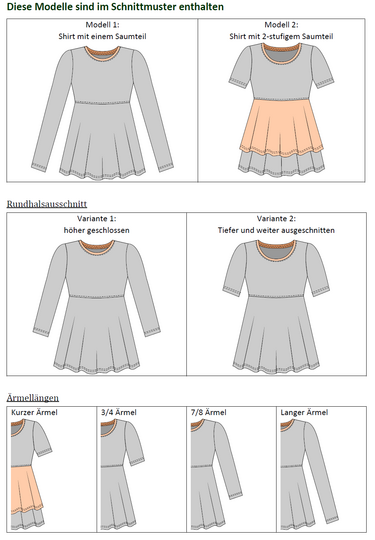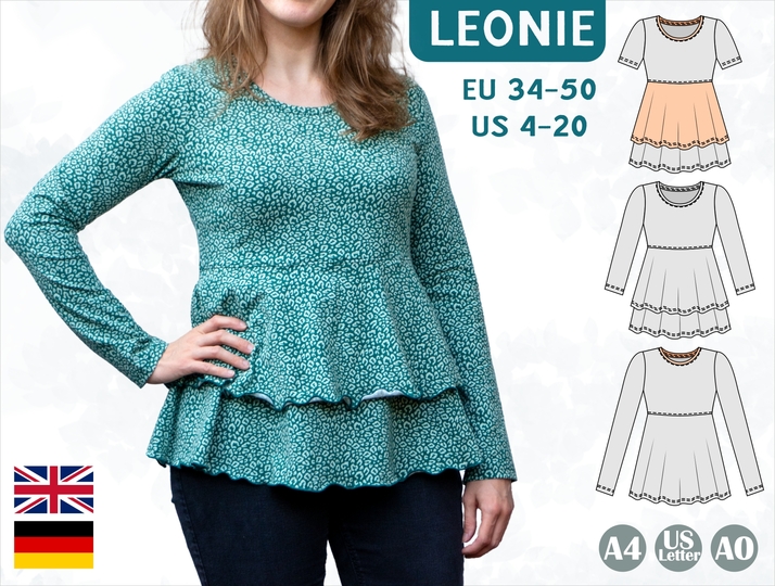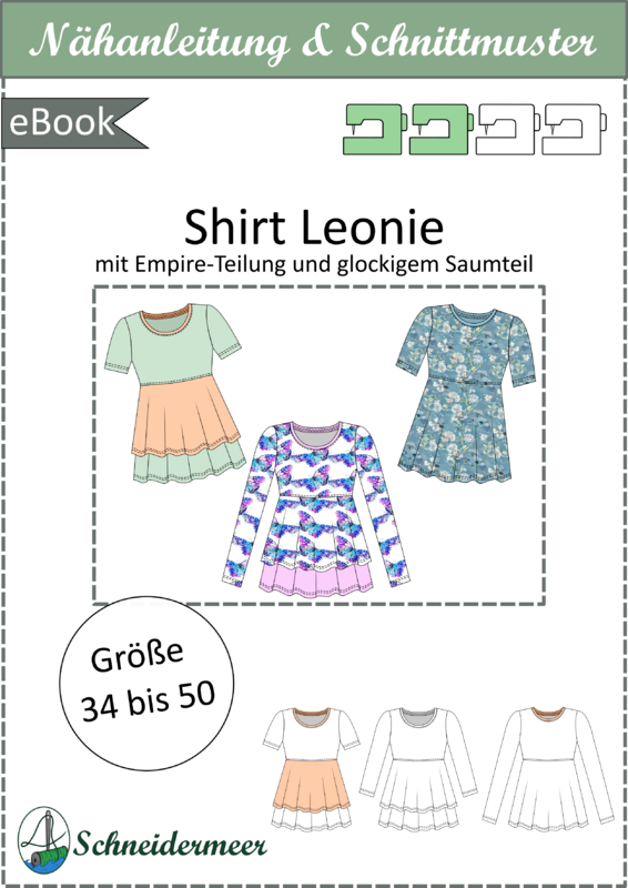 The “Leonie” pattern is a jersey shirt featuring an empire waistline and a flared hem section, which can be sewn as a single-layer hem or a two-tiered hem.
