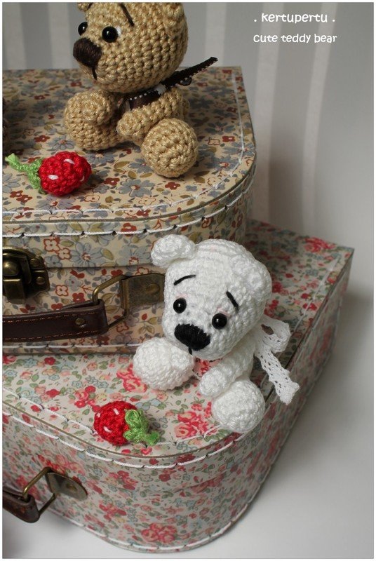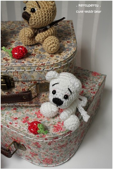 These little teddies are so cute and approximately 8 cm (3 inches) tall. Teddy is made out of cotton yarn and love. For your tiny teddy you can use every yarn you prefer - he's always so cute!