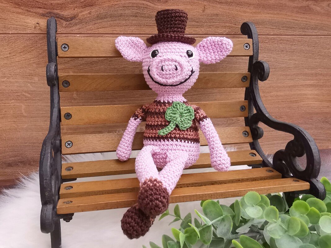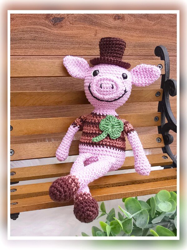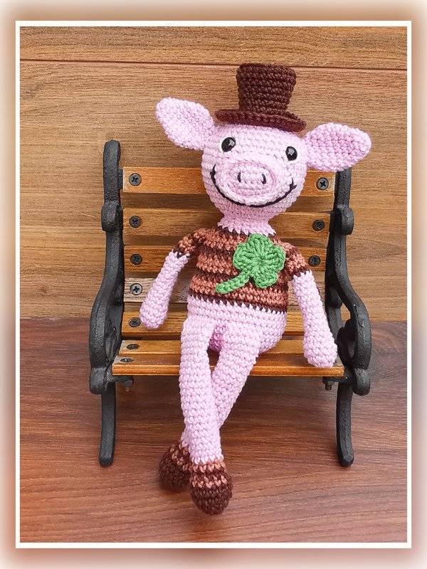 This cute little piggy here is made in one piece. The arms and legs will be crocheted in. You’ll only have to sew on the ears and muzzle in the end. Mr. Lucky has dangling legs and thus can only sit and not stand unsupported.