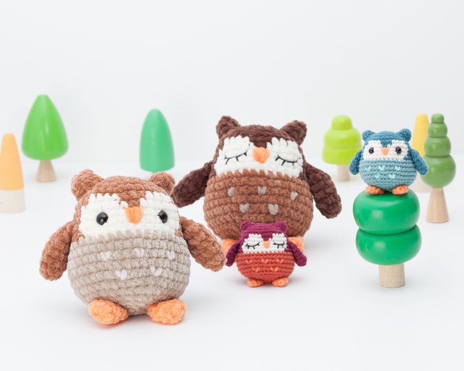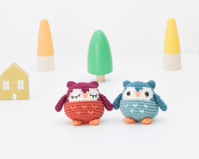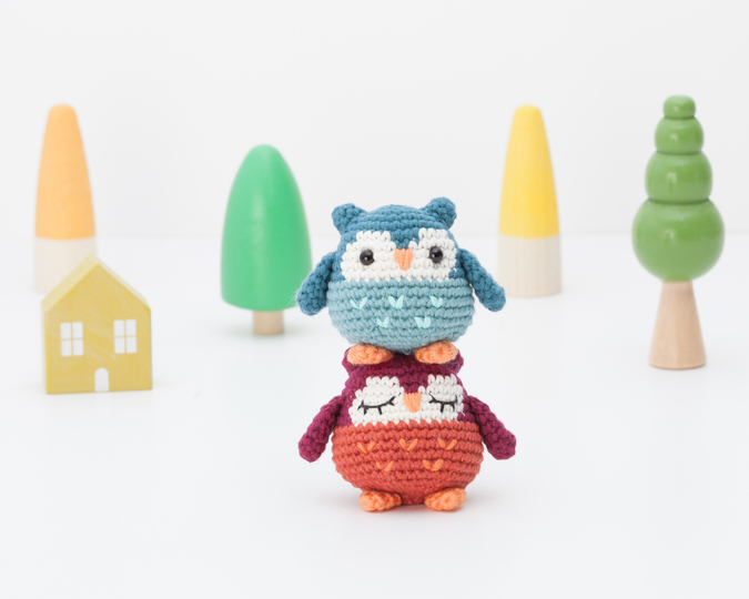 If you use the yarn and hook indicated, the big owl will be about 11 cm (4.3 inches) tall and the small owl will be about 5 cm (1,9 inches) tall. You can make it bigger or smaller using another type of yarn but, please, adapt the crochet hook and eyes accordingly.