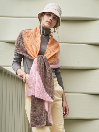 Tücher und Schals sind jetzt unverzichtbare Accessoires. Sie wärmen nicht nur, sondern vervollständigen mit diversen Farbspielen – hier in Nougat, Lachs und Rosa – jedes winterliche Outfit und kommen auch noch im Frühjahr zum Einsatz. Bei diesem breiten Schal aus federleichtem, doppelt verstricktem Alpaka-Seidengarn entstehen die grafischen Flächen in Intarsientechnik. Das heißt, Du verwendest für jede Farbfläche ein separates Knäuel und verkreuzstbeim Farbwechsel die Fäden auf der Arbeitsrückseite um Löcher zu vermeiden. Tipp: Stricke ein kleines Stück an und probiere es aus, es geht ganz einfach!