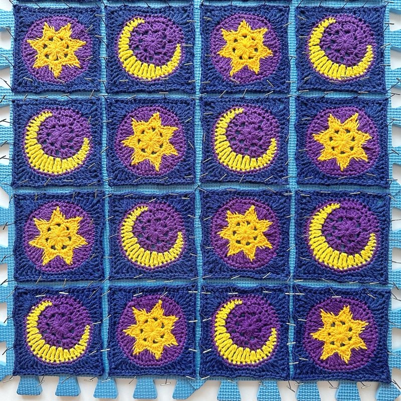 The Elenna Bag is a gorgeous bag made of celestial themed squares, perfect for advanced crocheters.