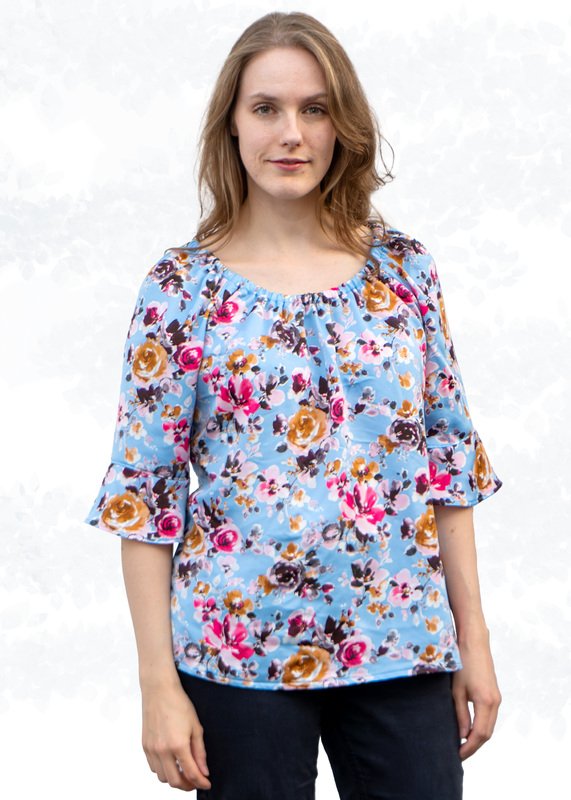 "Ida" features straight sleeves that are wide-cut and offers four different length options: short, 3/4, 7/8, and long. You have the option to gather the sleeve hems with elastic for a beautiful balloon effect. Additionally, the pattern includes a closer-fitting 3/4 sleeve with a stylish flounce.