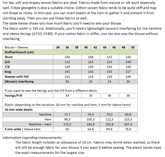The table below indicates how much fabric you'll need to sew your blouse, assuming a fabric width of 145 cm. Additionally, you'll need lightweight (interfacing) for the neck facings (G710, H180). If your cotton fabric is stiffer, you can choose to sew the blouse without interfacing.